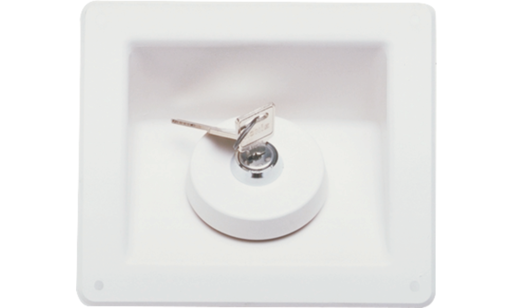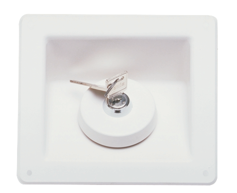 Wassereinfüllstutzen. Spritzwassergeschützter Schlossdeckel und 2 Schlüssel. Schlauchanschluss 40 mm ø, Ausschnitt 120 x 102 mm. Farbe Weiß.