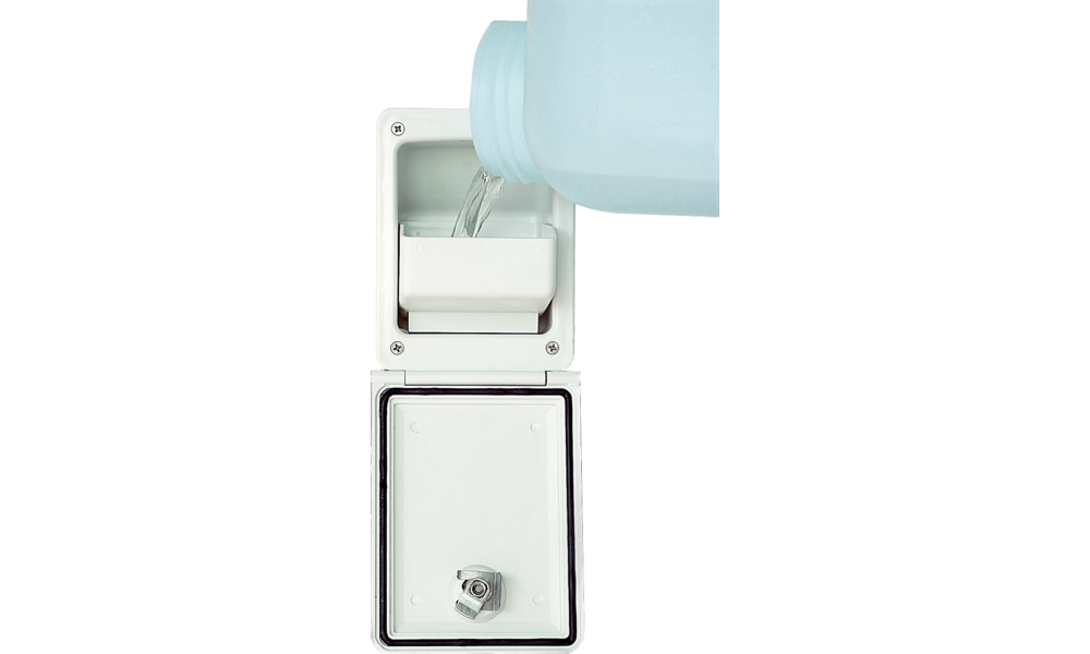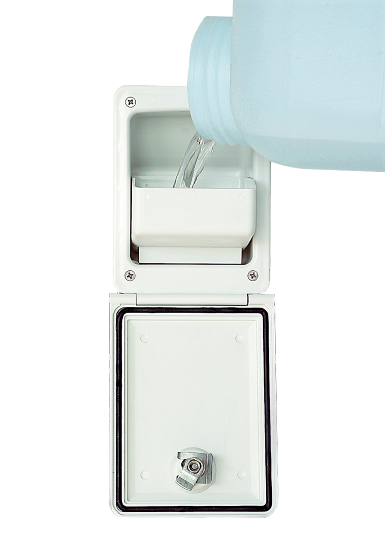 CARYSAN® Wasserbefüllklappe mit Trichter. Für Spiralschlauch 40 mm ø. Mit integriertem Trichter, der sich leicht in das Gehäuse einstecken lässt. Mit dem Trichter lässt sich mit fast allen Behältnissen Wasser ohne Schlauch oder Spezialausgießer leicht eingießen. Für Wohnmobil, Caravan, Boot, etc. geeignet.