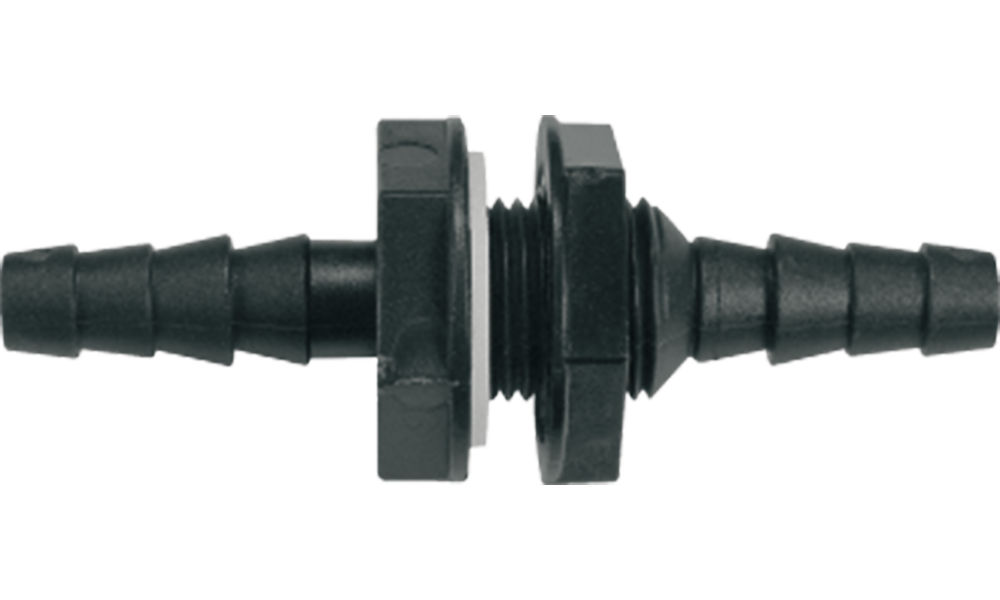 Gerade Tankdurchführung. Zur Entnahme oder Entlüftung in Kanistern und Wassertanks, mit Kontermutter und Dichtung. Schlauchanschluss beide Seiten 10/12 mm ø.
