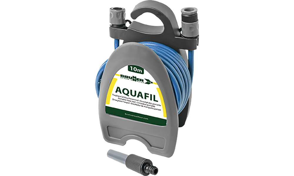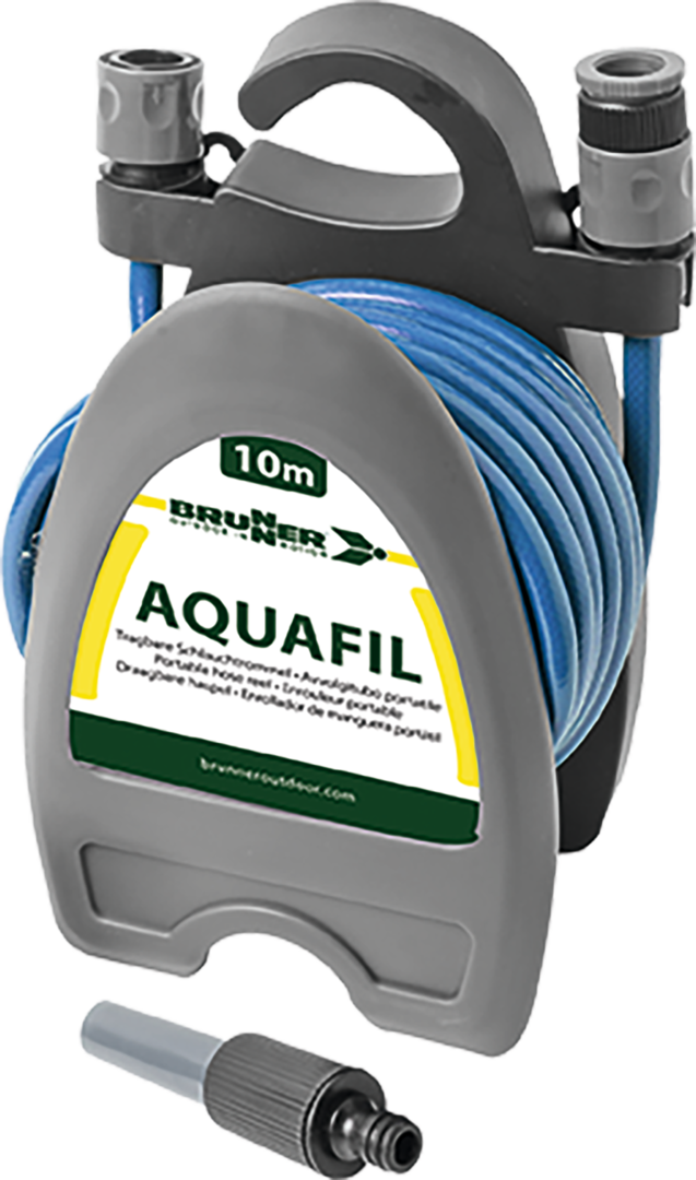 Schlauchtrommel AQUAFIL. Tragbare Schlauchtrommel mit lebensmittelechtem ⅜" PVC-Schlauch und 2 Schnellkupplungen. Gestell aus widerstandsfähigem Kunststoff. Kompakt, leicht und einfach zu transportieren. Komplett mit Spritzdüse. Geeignet für eine Vielzahl von Anwendungen.Schlauchlänge 10 m.