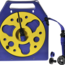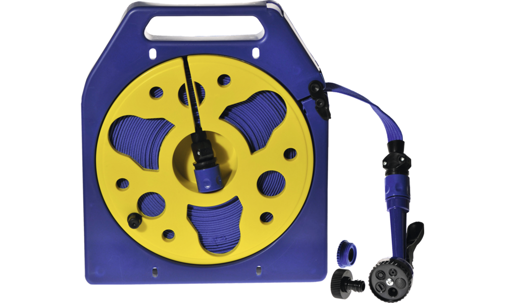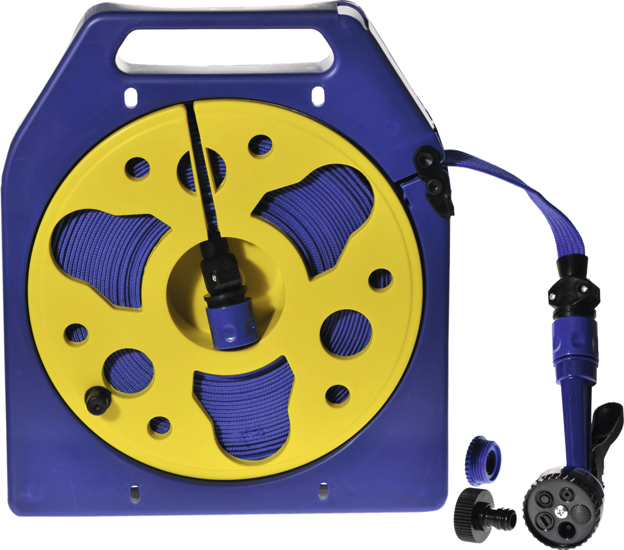 Flachschlauchkassette mit Gewebeschlauch zum Aufrollen. Geprüfte Lebensmittelqualität. Komplett mit 5-fach Multifunktions-Sprühpistole, zwei Schnellverschluss-Adaptern und Hahnanschluss (¾" und 1"). Schlauchlänge 15 m.