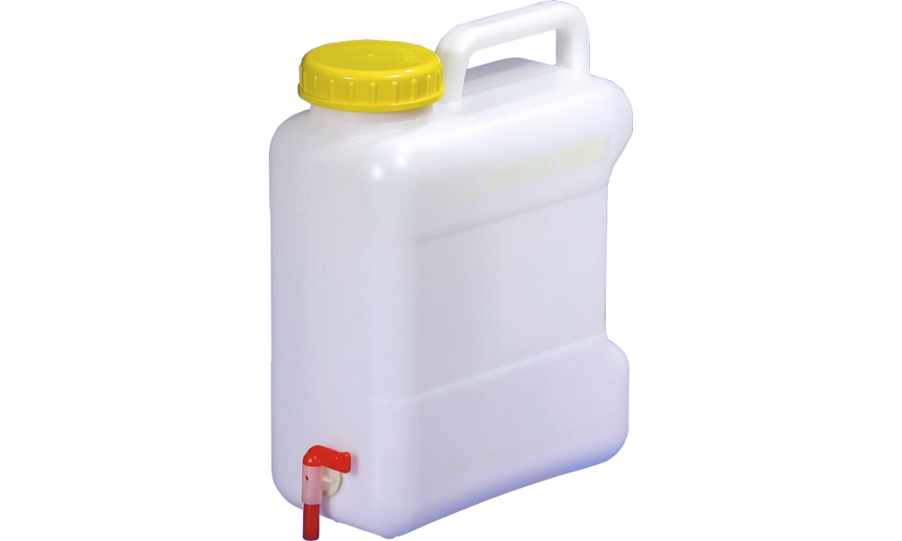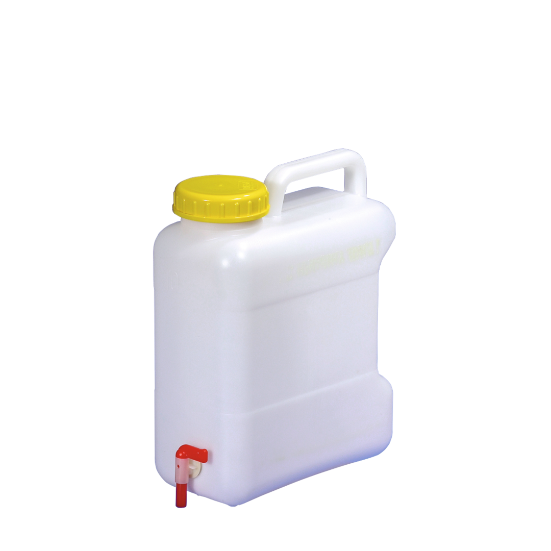 Weithals-Kanister DIN 96, mit Verschluss DIN 96, ¾"-Gewinde, mit Auslaufhahn und Verschlussdepot.