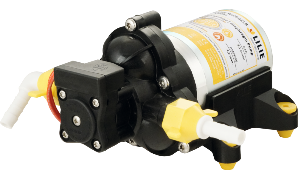LILIE CLASSIC-Serie WHISPER-KING. Extrem leise Druckwasserpumpe. Trockenlaufsicher. Spannung 12 V. Max. Förderleistung 10,0 l/min. Abschaltdruck 3,1 bar. Max. Stromaufnahme 5,9 A. Max. Ansaughöhe 3,1 m.