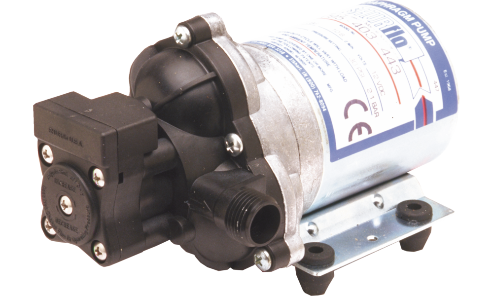 SHURflo TRAIL KING 10. Trockenlaufsichere Druckwasserpumpe. Spannung 12 V. Max. Förderleistung 10,6 l/min. Abschaltdruck 2,1 bar. Max. Stromaufnahme 4 A.