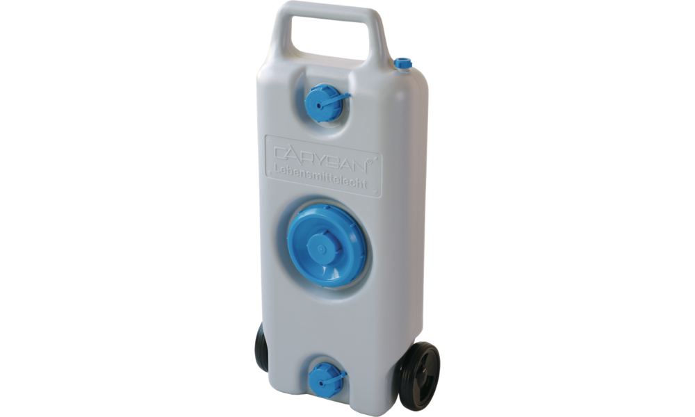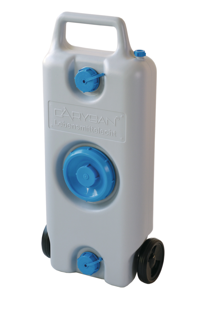 Mit Ziehgriff und PVC-Bereifung. An der Oberseite zwei Schraubverschlüsse mit je ca. 4,5 cm ø für den Anschluss von Tauch- oder anderen Wasserpumpen und eine große Reinigungsöffnung mit 14,5 cm ø.