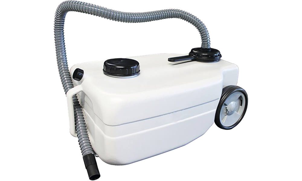 Rollwassertank. Ein kompakter Kunststoffwassertank für Frisch- und Abwasser. Inklusive ausziehbarem Tragegriff und flexiblem Spiralschlauch.