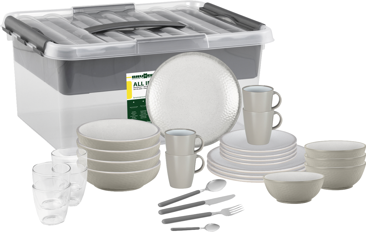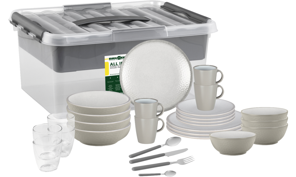 All-Inclusive-VIP-Box AMADÈ. 40-teiliges Set bestehend aus 4 Esstellern ø 25 cm, 4 Suppentellern ø 20 cm, 4 Desserttellern ø 20 cm, 4 Schüsseln ø 15 cm, 4 Henkelbechern 30 cl, 4 Gläsern 20 cl und 16-teiligem Besteckset.