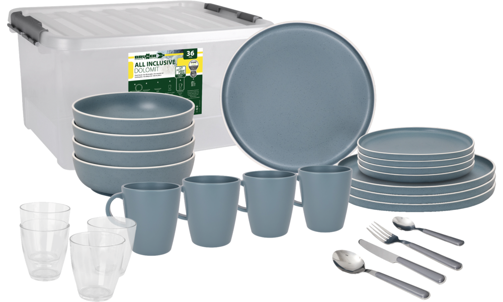 36-teiliges Melamin-Set bestehend aus 4 Esstellern ø 25 cm, 4 Desserttellern ø 20 cm, 4 Suppentellern ø 20 cm, 4 Henkelbechern 30 cl, 4 Gläsern 20 cl und 16-teiligem Besteckset