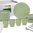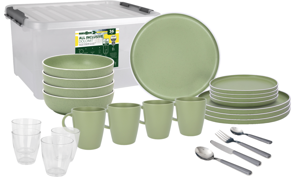 36-teiliges Melamin-Set bestehend aus 4 Esstellern ø 25 cm, 4 Desserttellern ø 20 cm, 4 Suppentellern ø 20 cm, 4 Henkelbechern 30 cl, 4 Gläsern 20 cl und 16-teiligem Besteckset