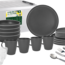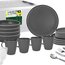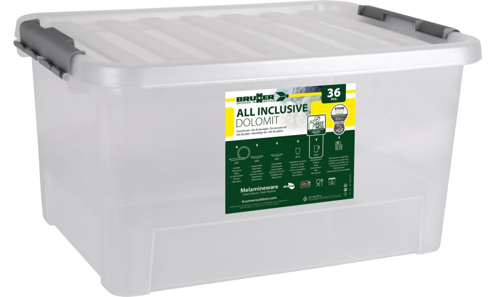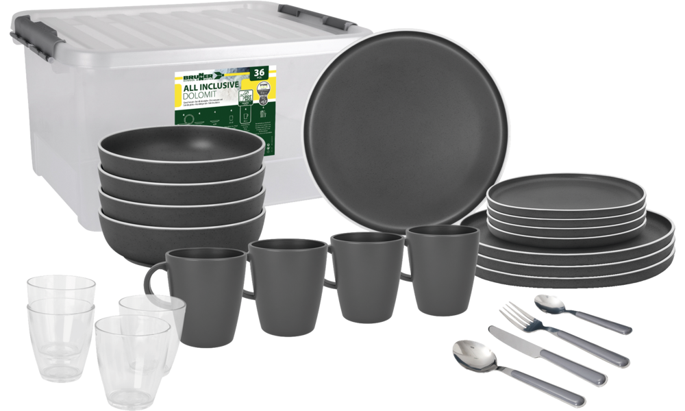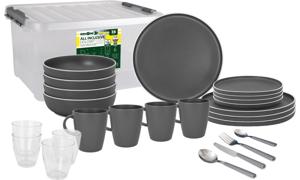 36-teiliges Melamin-Set bestehend aus 4 Esstellern ø 25 cm, 4 Desserttellern ø 20 cm, 4 Suppentellern ø 20 cm, 4 Henkelbechern 30 cl, 4 Gläsern 20 cl und 16-teiligem Besteckset