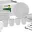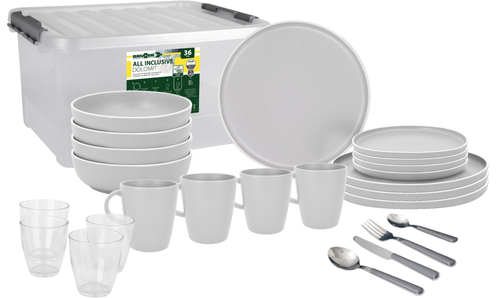 36-teiliges Melamin-Set bestehend aus 4 Esstellern ø 25 cm, 4 Desserttellern ø 20 cm, 4 Suppentellern ø 20 cm, 4 Henkelbechern 30 cl, 4 Gläsern 20 cl und 16-teiligem Besteckset