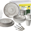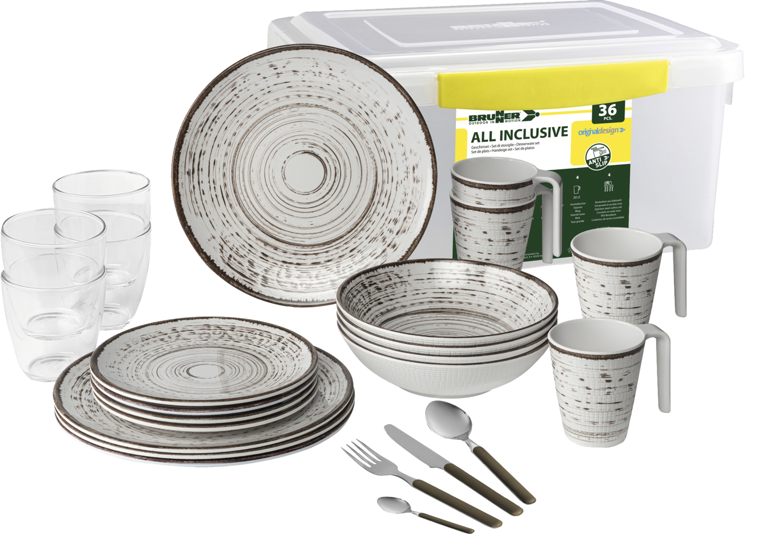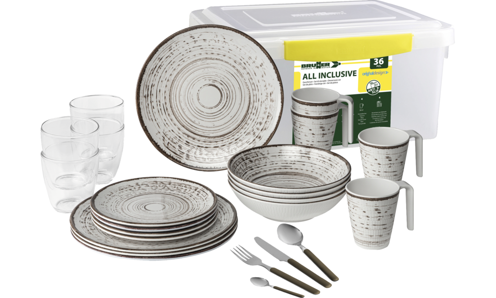 36-teiliges Set bestehend aus 4 Esstellern ø 25 cm, 4 Suppentellern ø 21 cm, 4 Desserttellern ø 20 cm, 4 Henkelbechern 0,3 l, 4 Bechern 0,2 l und 16-teiligem Besteckset (je 4 x Löffel, Gabel, Messer, Teelöffel).