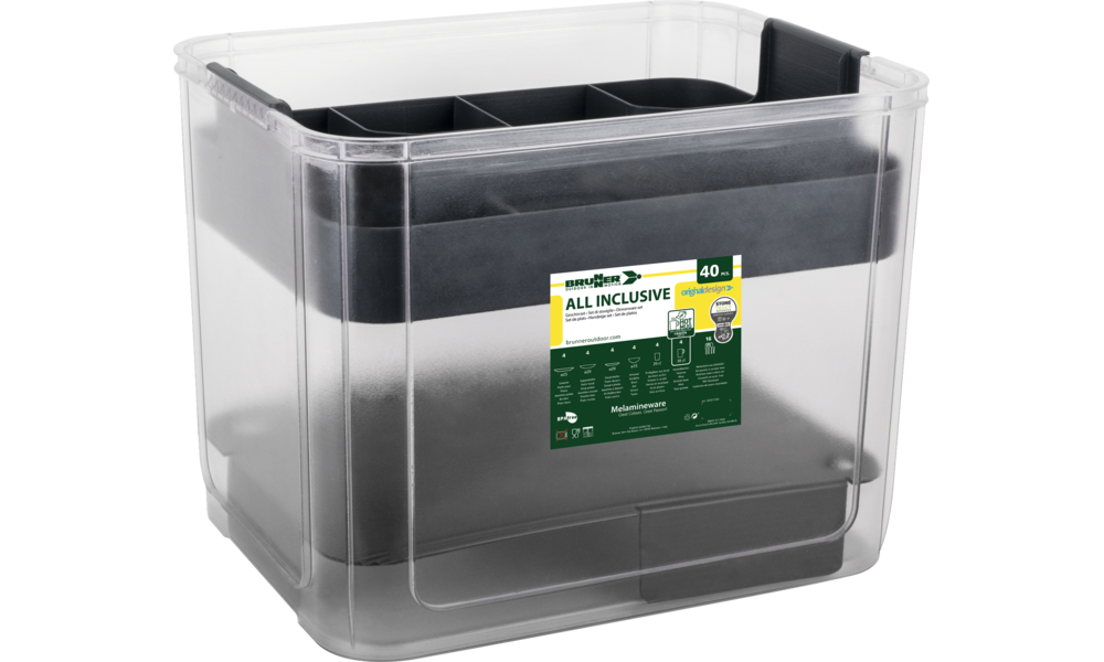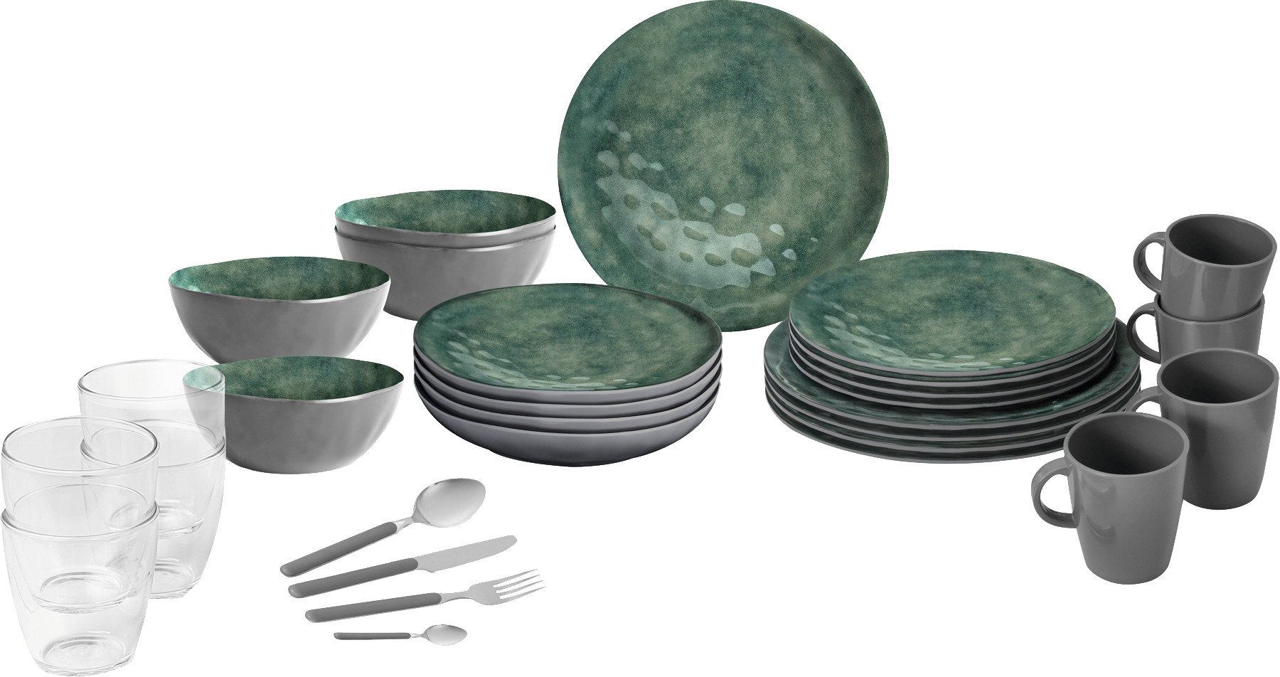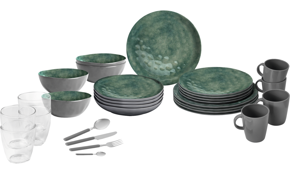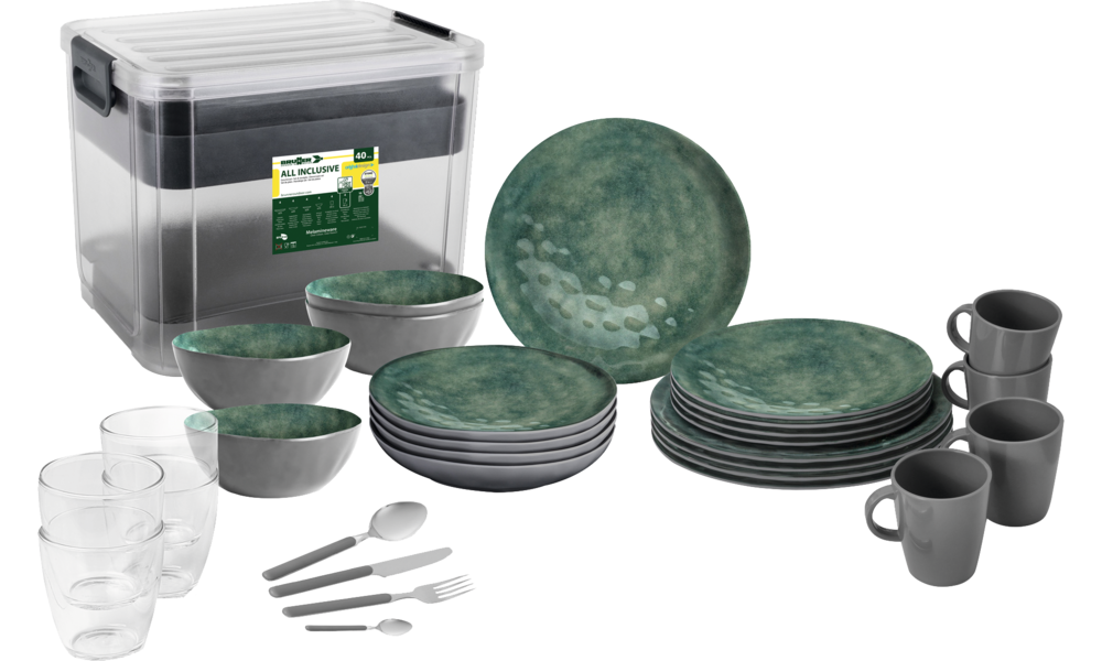 40-teiliges Set bestehend aus 4 Esstellern ø 25 cm, 4 Suppentellern ø 21 cm, 4 Desserttellern ø 21 cm, 4 Schüsseln ø 18 cm, 4 Henkelbechern 30 cl, 4 Gläsern 20 cl und 16-teiligem Besteckset.