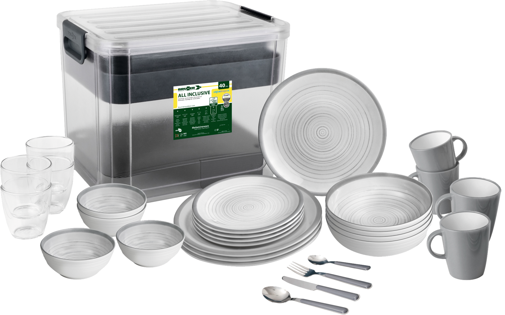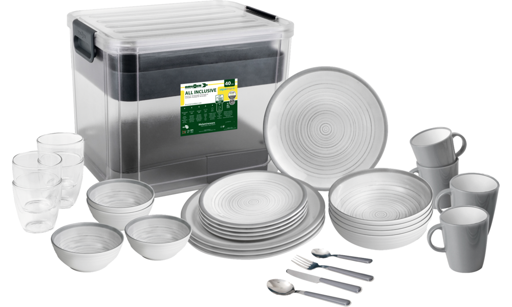 All Inclusive VIP BELLAGIO. 40-teiliges Set bestehend aus 4 Esstellern ø 26 cm, 4 Suppentellern ø 21 cm, 4 Desserttellern ø 21 cm, 4 Schüsseln ø 15 cm, 4 Henkelbechern 0,3 l, 4 Gläsern 0,2 l und 16-teiligem Besteckset.