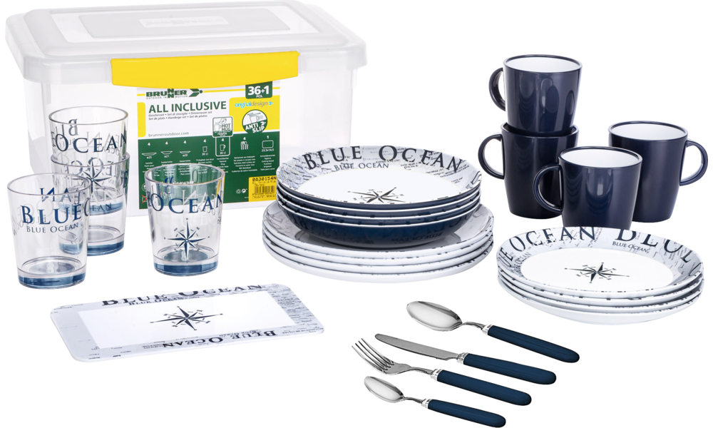 All-Inclusive-Box. 36-teiliges Set in robuster Transportbox bestehend aus 4 Esstellern ø 25 cm, 4 Suppentellern ø 21 cm, 4 Desserttellern ø 20 cm, 4 Henkelbechern 30 cl, 4 Acryl-Trinkgläsern 30 cl sowie einem 16-teiligen Besteckset (je 4 x Löffel, Gabel, Messer, Teelöffel).