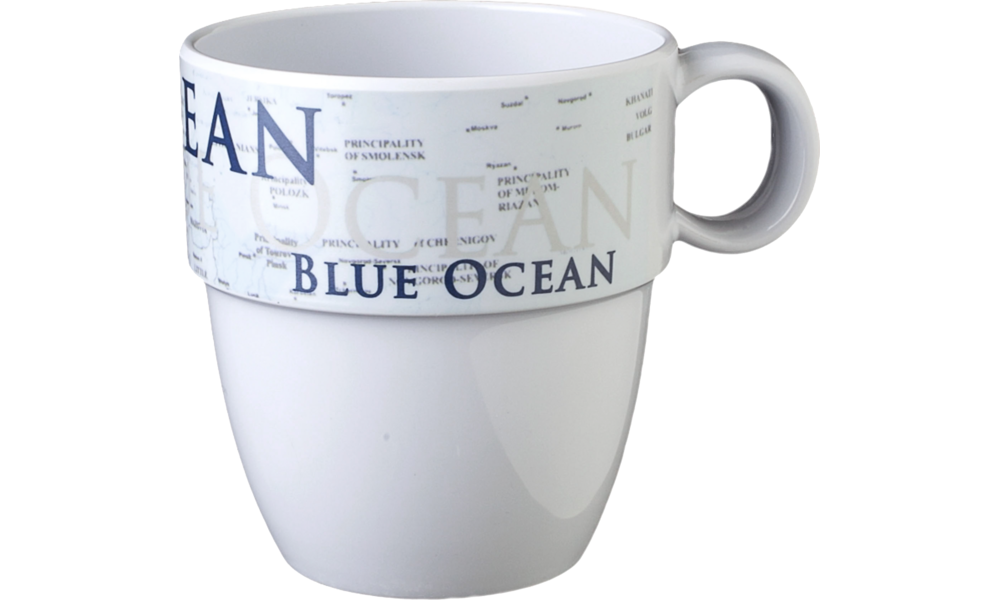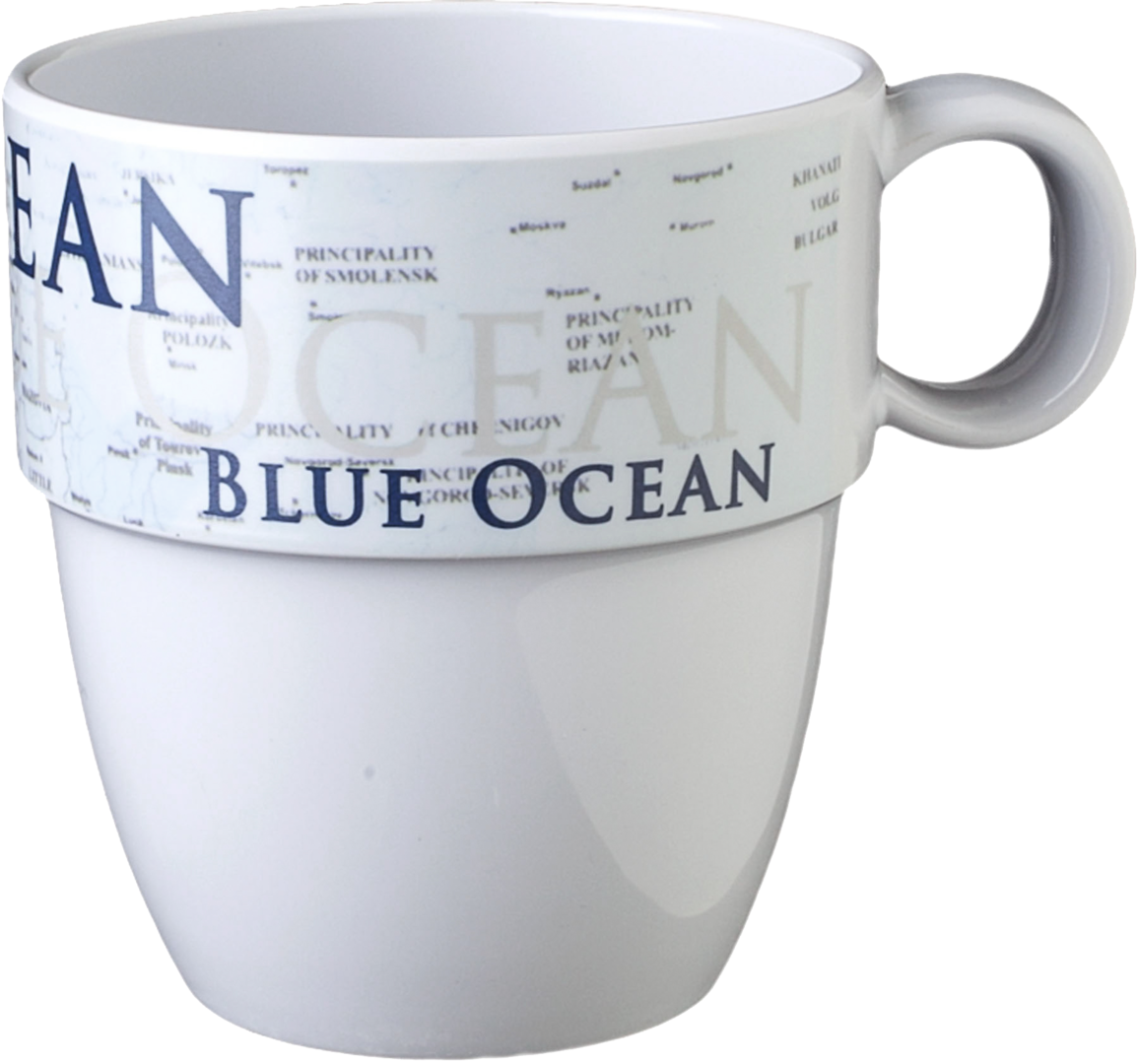 Geschirrserie BLUE OCEAN Henkelbecher 30 cl. Geschirrserie im Maritim-Look. Alle Melaminteile sind mit dem Anti-Slip-System ausgestattet, einer in den Tellerboden integrierten Antirutsch-Dichtung. So können Sie selbst während einer Bootsfahrt Ihr Essen genießen, außerdem wird Klappern reduziert. Geschirr ist lebensmittelecht und weitgehend spülmaschinengeeignet. Nicht mikrowellengeeignet