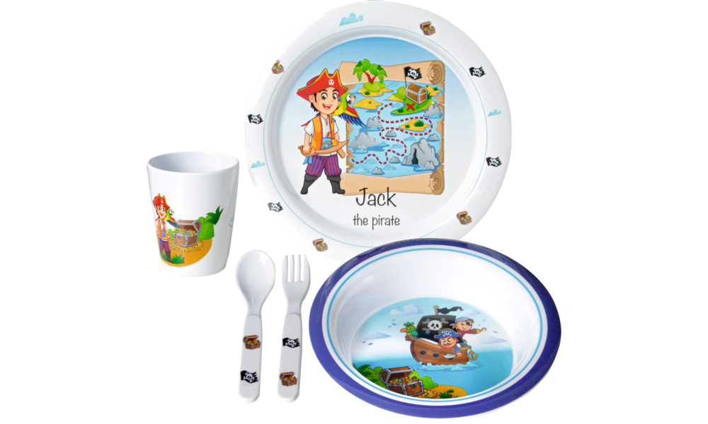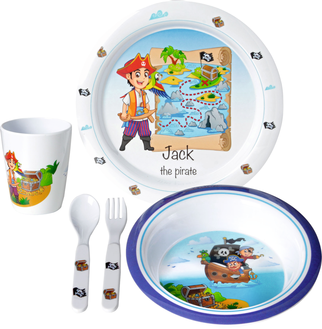 Kindergeschirrset Jack. 5-teiliges Kindergeschirrset aus hochwertigem Melamin. Set bestehend aus Essteller, Suppenteller, Trinkbecher und 2-teiligem Besteck. Für Kinder ab 3 Jahren.