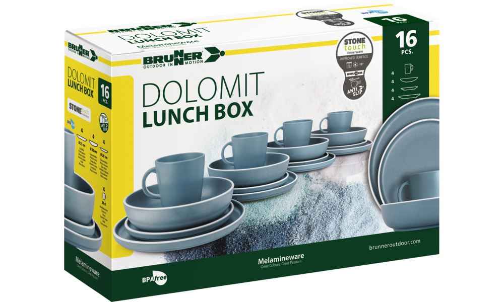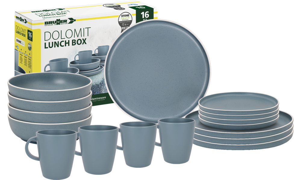 16-teiliges Melamin-Set bestehend aus 4 Esstellern ø 25 cm, 4 Desserttellern ø 20 cm, 4 Suppentellern ø 20 cm und 4 Henkelbechern 30 cl.