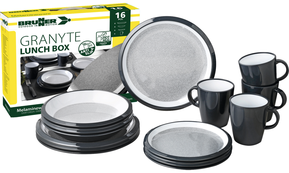 Lunch-Box GRANYTE. 16-teiliges Set bestehend aus 4 Esstellern ø 24,5 cm, 4 Suppentellern ø 21,5 cm, 4 Desserttellern ø 19,5 cm und 4 Henkelbechern 30 cl.