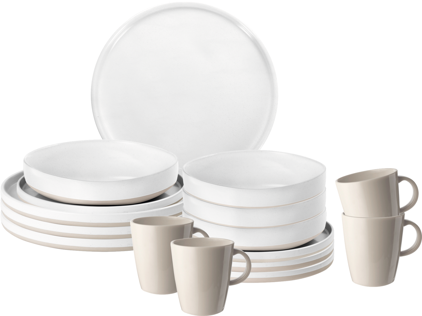 16-teiliges Set bestehend aus 4 Esstellern ø 26 cm, 4 Suppentellern ø 21 cm, 4 Desserttellern ø 19 cm und 4 Henkelbecher 0,3 l.