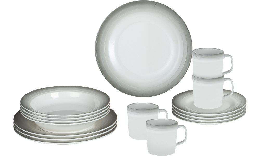 Melamin-Set ASTRALYS. 16-teiliges Geschirrset aus hochwertigem Melamin. Spülmaschinengeeignet, bruchunempfindlich, geruchs- und geschmacksneutral und lebensmittelecht. Nicht mikrowel-lengeeignet. Bestehend aus 4 Esstellern ø 25 cm, 4 Desserttellern ø 20 cm, 4 Suppentellern ø 22 cm und 4 Henkelbechern 30 cl.