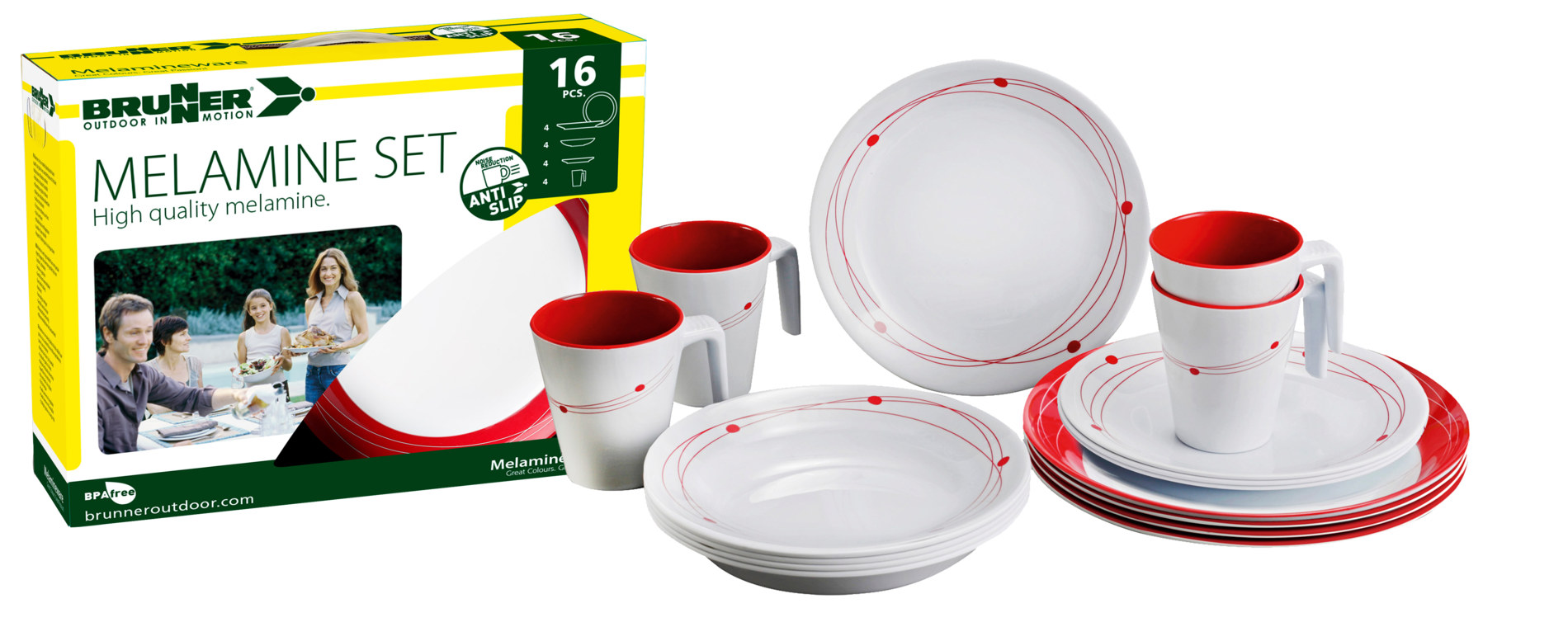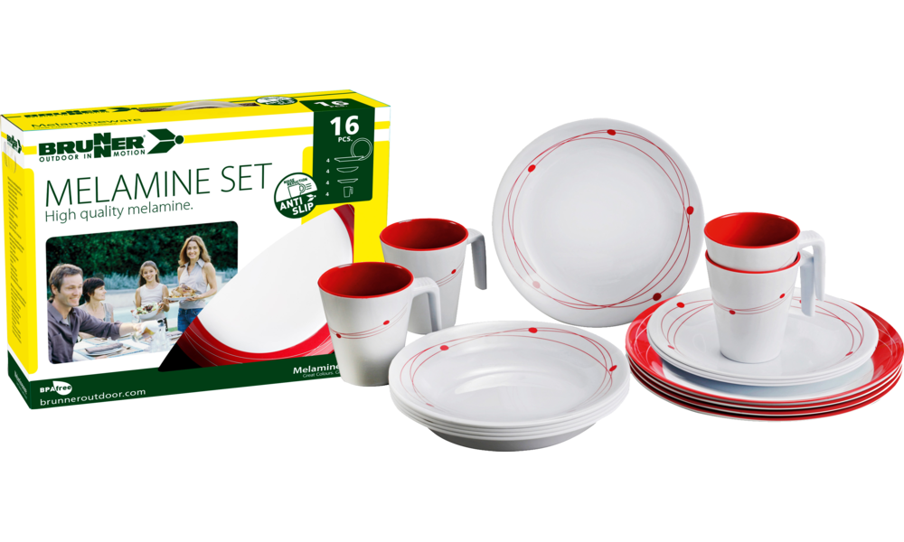 Melamin-Set COSMIC. 16-teiliges Geschirrset aus hochwertigem Melamin. Spülmaschinenfest, lebensmittelecht und bruchunempfindlich. Nicht mikrowellengeeignet. Bestehend aus 4 Esstellern ø 25 cm, 4 Suppentellern ø 21 cm, 4 Desserttellern ø 20 cm und 4 Henkelbechern 30 cl.