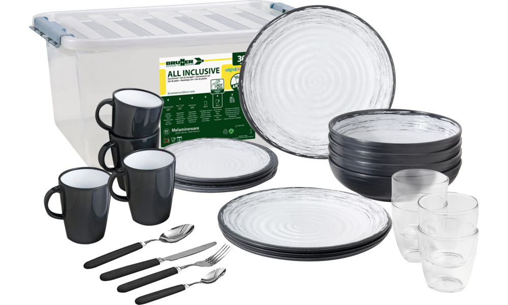 All Inclusive GRANADA. 36-teiliges Set bestehend aus 4 Esstellern ø 26 cm, 4 Suppentellern ø 21 cm, 4 Desserttellern ø 21 cm, 4 Henkelbechern 0,3 l, 4 Bechern 0,2 l und 16-teiligem Besteckset (je 4 x Löffel, Gabel, Messer, Teelöffel).