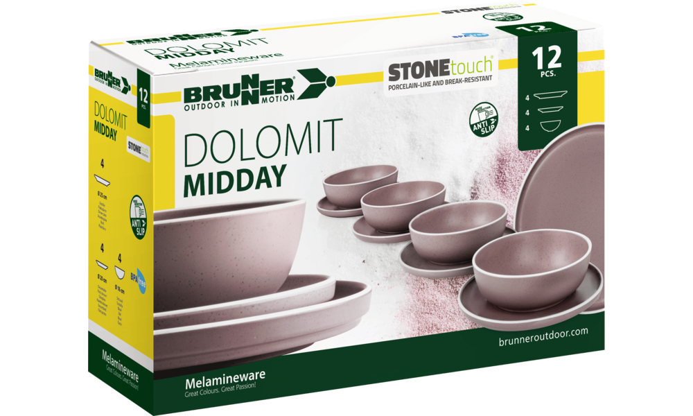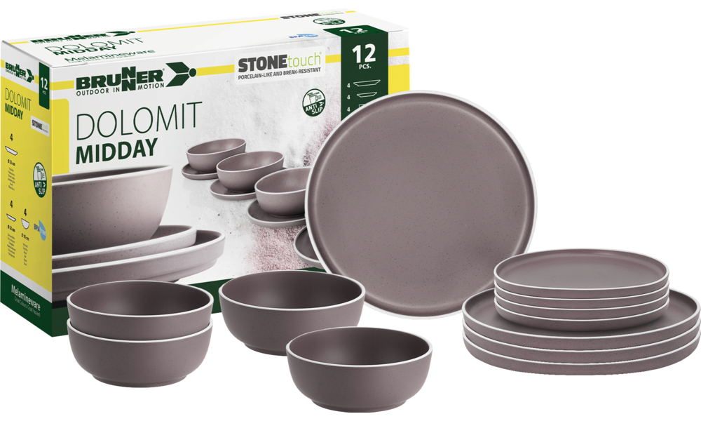 12-teiliges Set bestehend aus 4 Esstellern ø 26 cm, 4 Desserttellern ø 21 cm und 4 Schüsseln ø 15 cm.