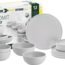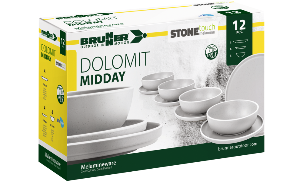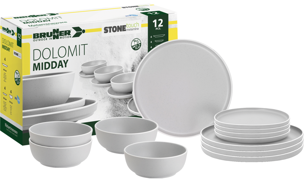 12-teiliges Melamin-Set bestehend aus 4 Esstellern ø 25 cm, 4 Desserttellern ø 20 cm und 4 Schüsseln ø 16 cm.