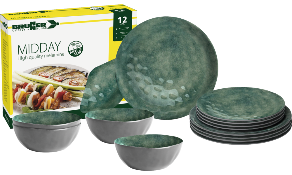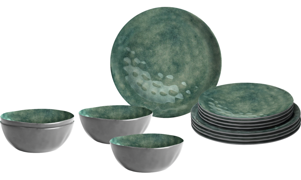 12-teiliges Set bestehend aus 4 Esstellern ø 25 cm, 4 Desserttellern ø 21 cm und 4 Schüsseln ø 18 cm.