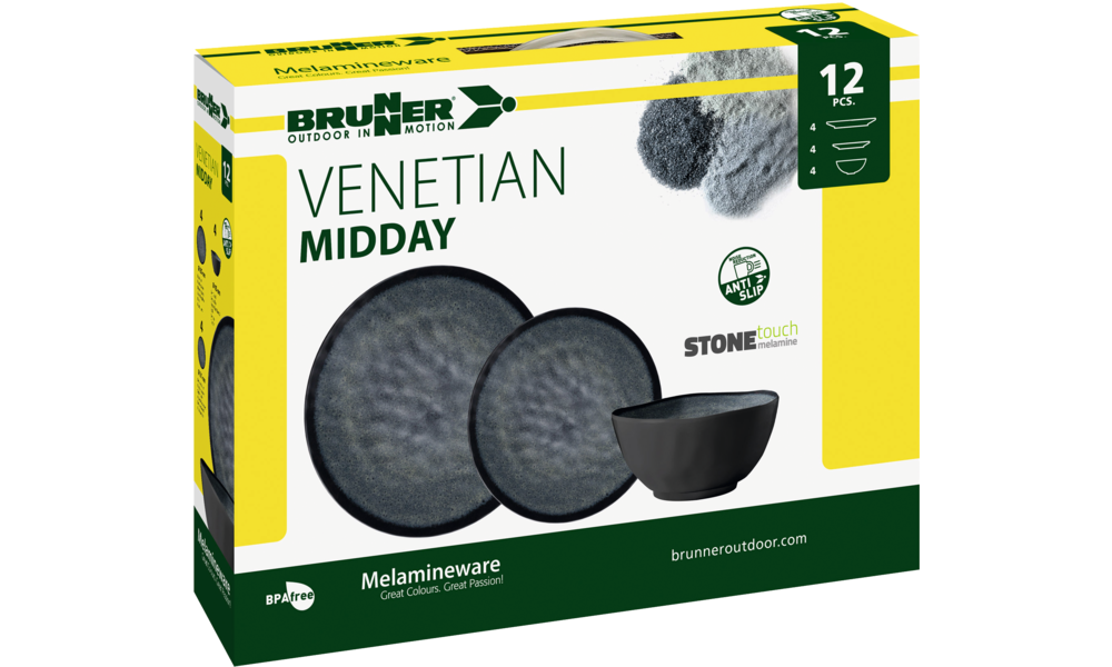 Midday-Set VENETIAN. 12-teiliges Set bestehend aus 4 Esstellern ø 25 cm, 4 Desserttellern ø 21 cm und 4 Schüsseln ø 15 cm.
