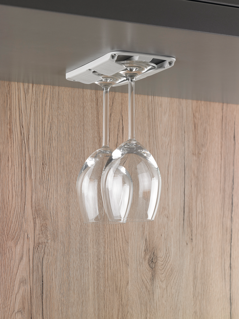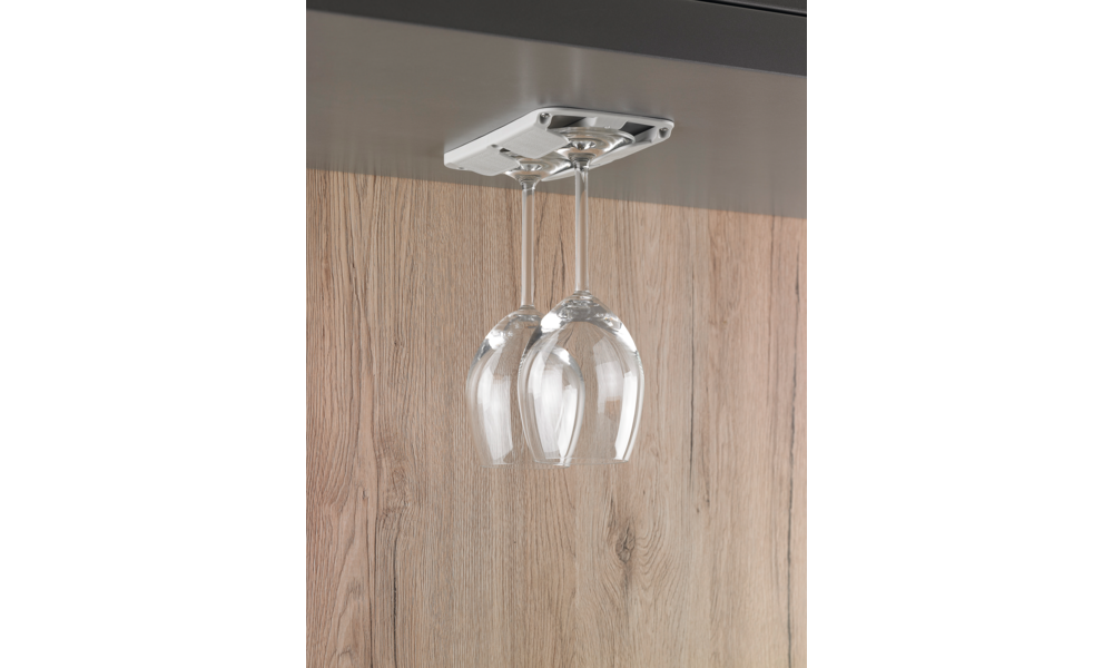 Rotweinglashalter zum sicheren Einschub von zwei Gläsern mit Stielfuß.
