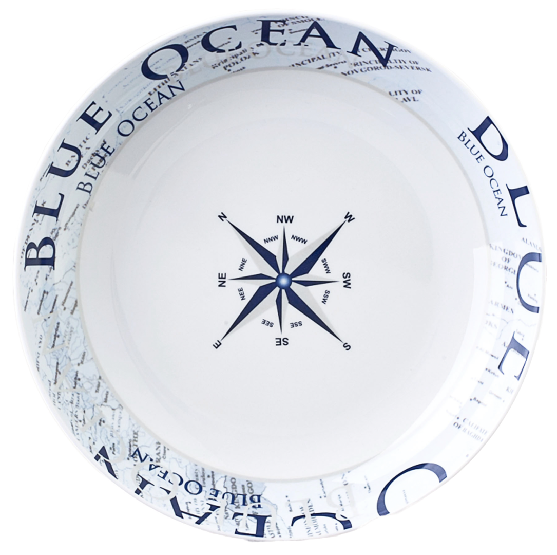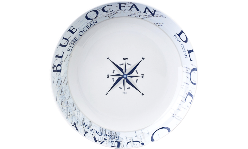 Geschirrserie BLUE OCEAN. Geschirrserie im Maritim-Look. Alle Melaminteile sind mit dem Anti-Slip-System ausgestattet, einer in den Tellerboden integrierten Antirutsch-Dichtung. So können Sie selbst während einer Bootsfahrt Ihr Essen genießen, außerdem wird Klappern reduziert. Geschirr ist lebensmittelecht und weitgehend spülmaschinengeeignet. Nicht mikrowellengeeignet. Suppenteller ø 21 cm