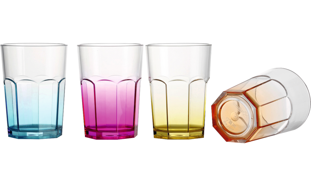 Trinkgläser-Set OCTOGLASS COLOR. Trinkglas mit farbiger Basis und praktischem Antislip-Ring. Der im Glasboden integrierte Antirutschring verhindert effektiv das Verrut-schen des Trinkglases auf Tischen oder in den Schränken. Stapelbar. Volumen je 28 cl. 4er-Set.