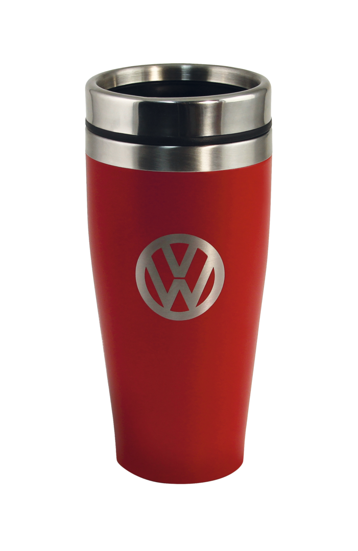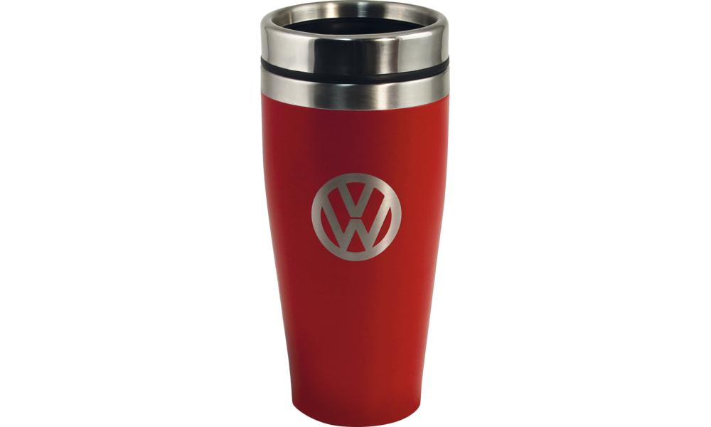 Doppelwandige Vakuum Thermosflasche oder Thermobecher aus hochwertigem Edelstahl 18/8 mit Volkswagen Schriftzug und VW Logo, herausgelasert aus einer robusten einfarbigen Pulverbeschichtung.