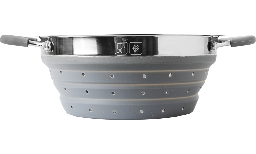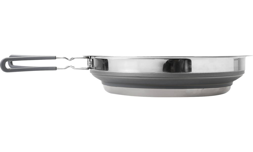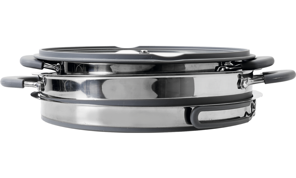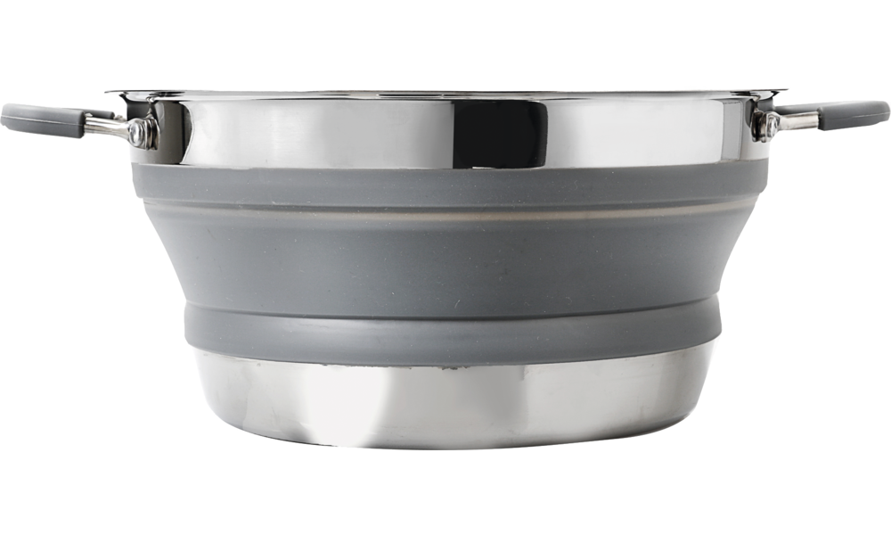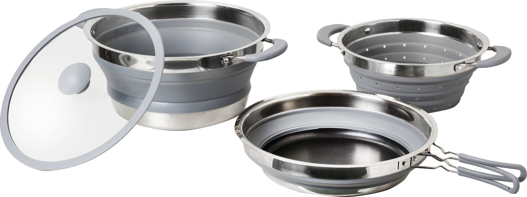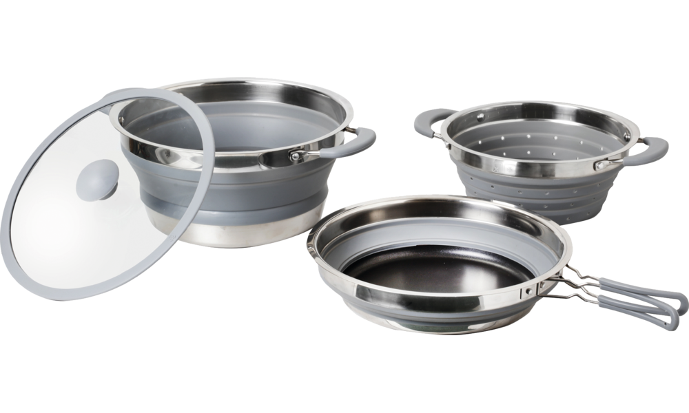 Alle Töpfe und Pfannen sind flach zusammenklappbar und machen dieses Set zu einer idealen platzsparenden Lösung für Wohnmobile und Camping.