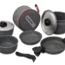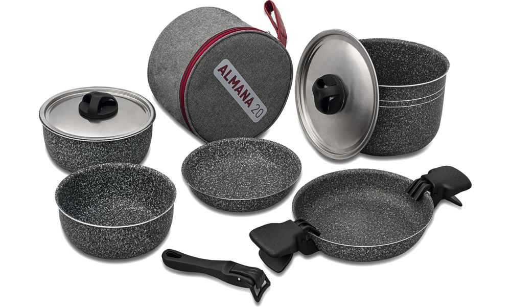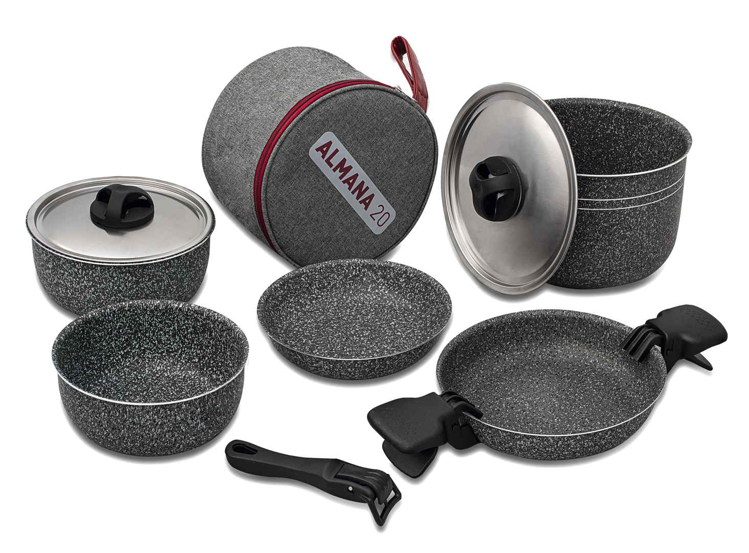 Kochtopfset ALMANA 20. Kochgeschirr aus 99,5 % Aluminium, lebensmittelecht und mit Antihaft-Beschichtung. Set bestehend aus 1 Topf ø 20 cm, 1 Topf ø 18 cm, 1 Topf ø 16 cm, 1 Pfanne ø 20 cm, 1 Pfanne ø 18 cm, 1 Deckel ø 20 cm, 1 Deckel ø 18 cm, 2 Topfgriffe, 1 Stielgriff und 1 Tasche. Geeignet für drei Personen.