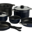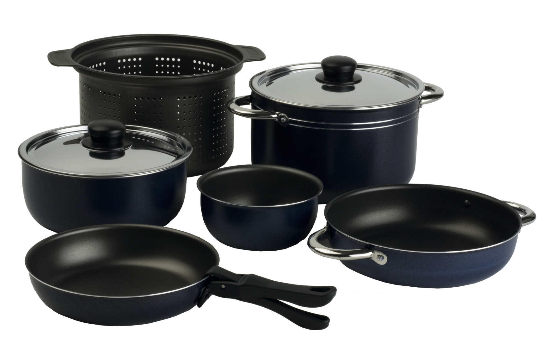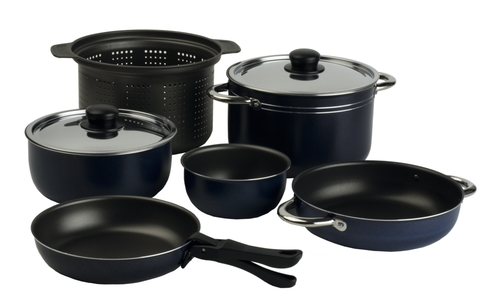 Kochtopfset BLUE SKY 22. Kochgeschirr aus 99,5 % Aluminium, lebensmittelecht und mit Antihaft-Beschichtung. 9-teiliges Set bestehend aus 1 Topf ø 22 cm, 1 Topf ø 20 cm, 1 Topf ø 16 cm, 1 Pfanne ø 22 cm, 1 Pfanne ø 20 cm, 1 Deckel ø 22 cm, 1 Deckel ø 20 cm, 1 Aluminiumsieb und 1 Stielgriff. Geeignet für fünf Personen.