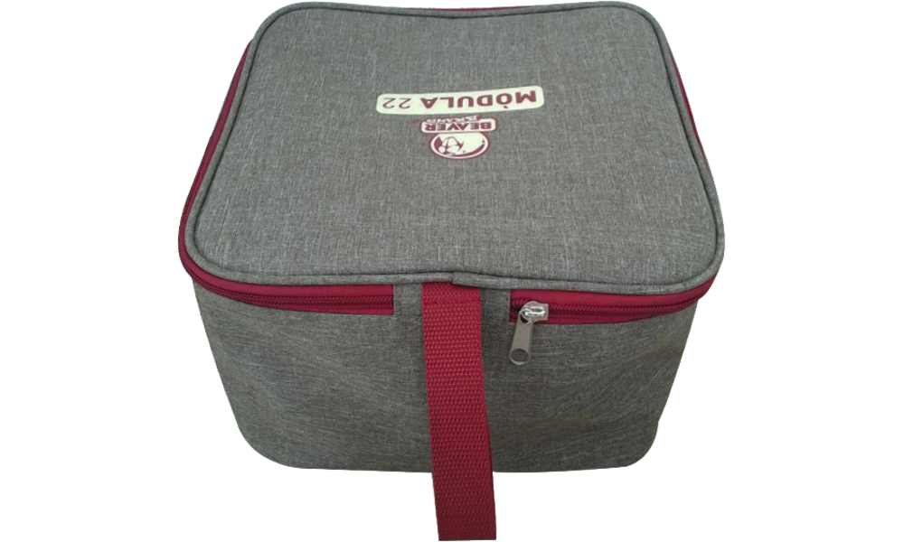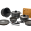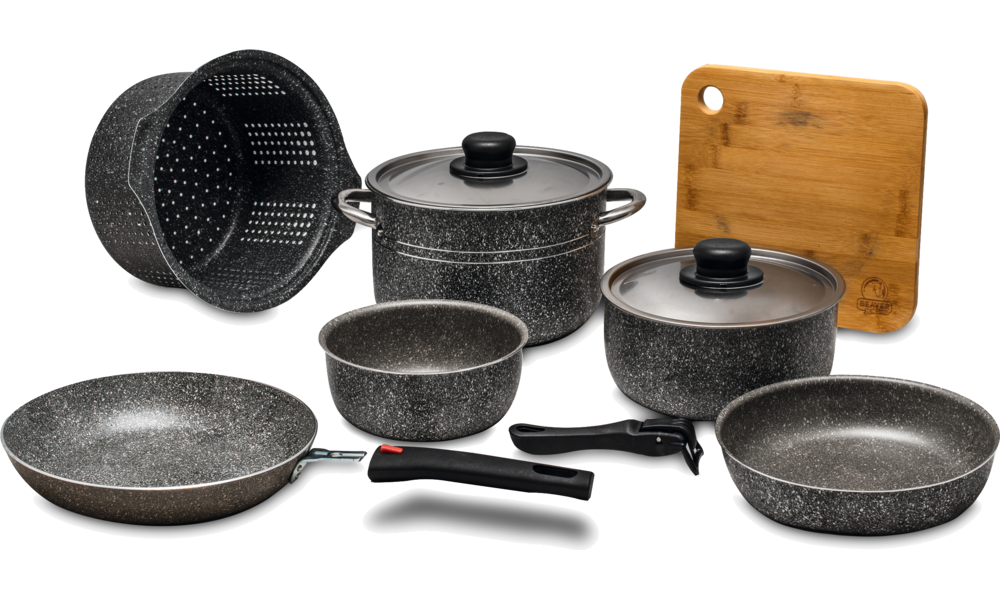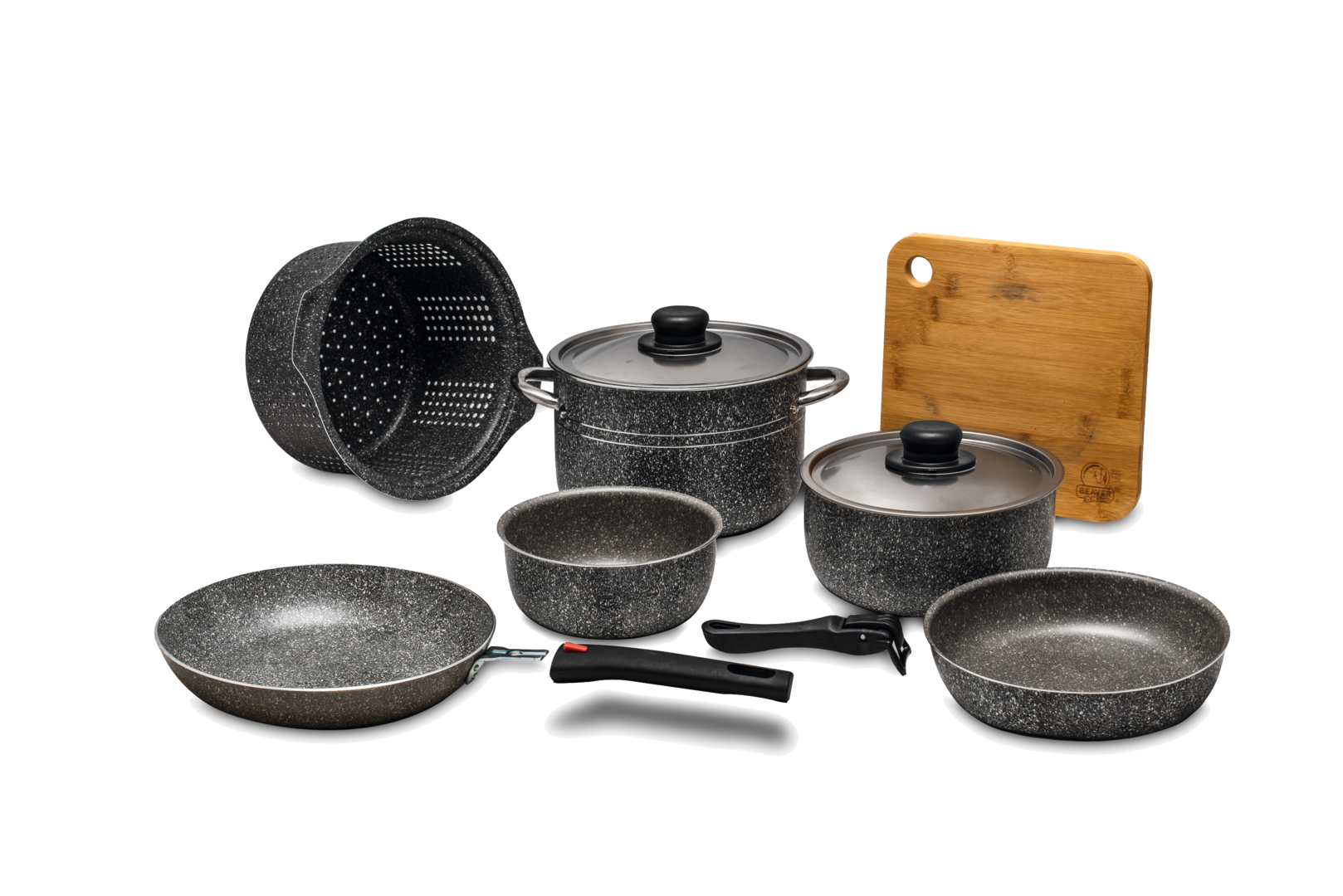 Kochtopfset MODULA 22. Kochgeschirr aus 99,5 % Aluminium, lebensmittelecht und mit Antihaft-Beschichtung. 11-teiliges Set bestehend aus 1 Topf ø 22 cm, 1 Topf ø 20 cm, 1 Topf ø 16 cm, 1 Pfanne ø 24 cm mit abnehmbarem Griff, 1 Pfanne ø 20 cm, 1 Deckel ø 22 cm, 1 Deckel ø 20 cm, 1 Aluminiumsieb, 1 Schneidebrett aus Bambus, 1 Stielgriff und 1 Tasche. Geeignet für 5 Personen.
