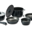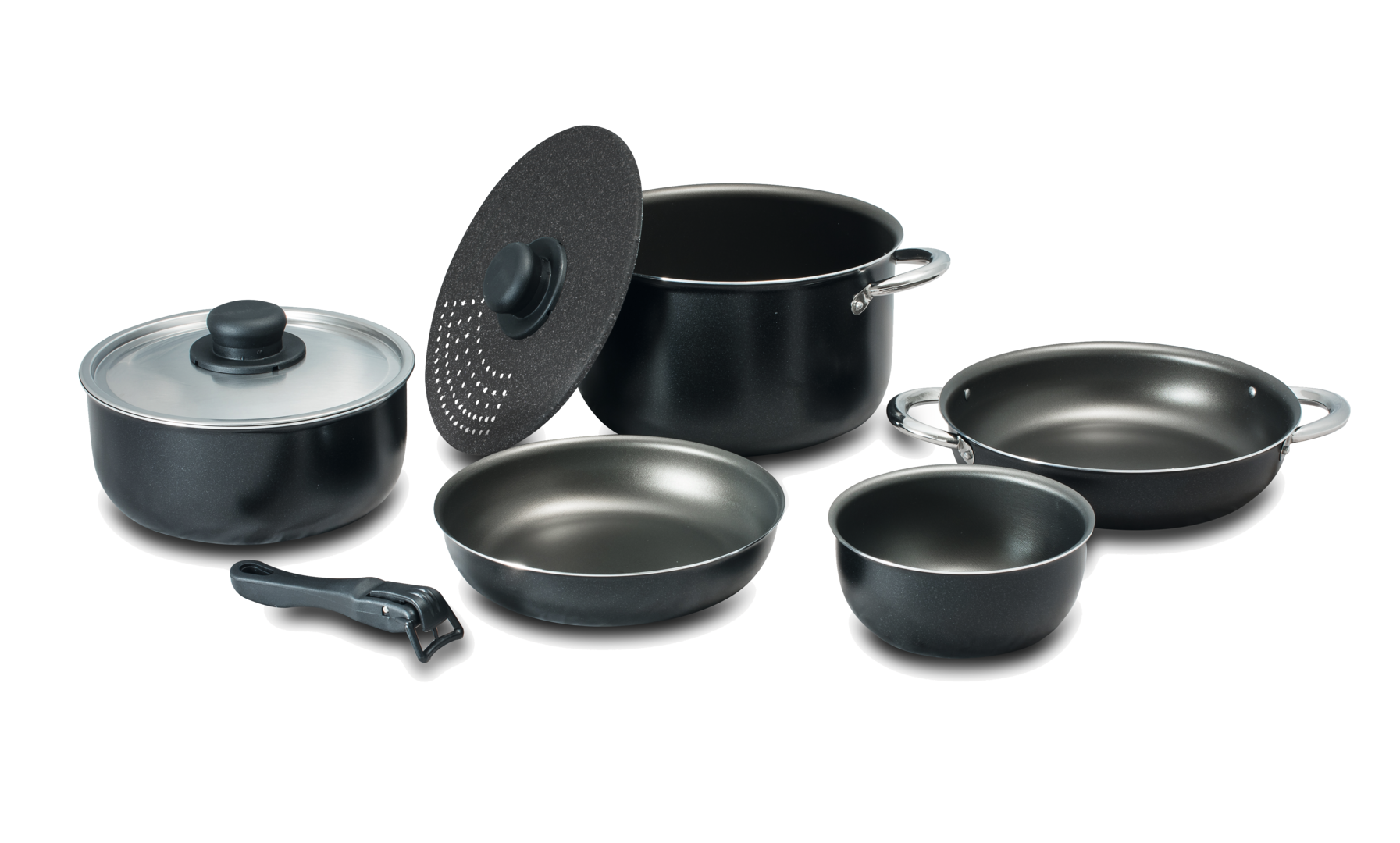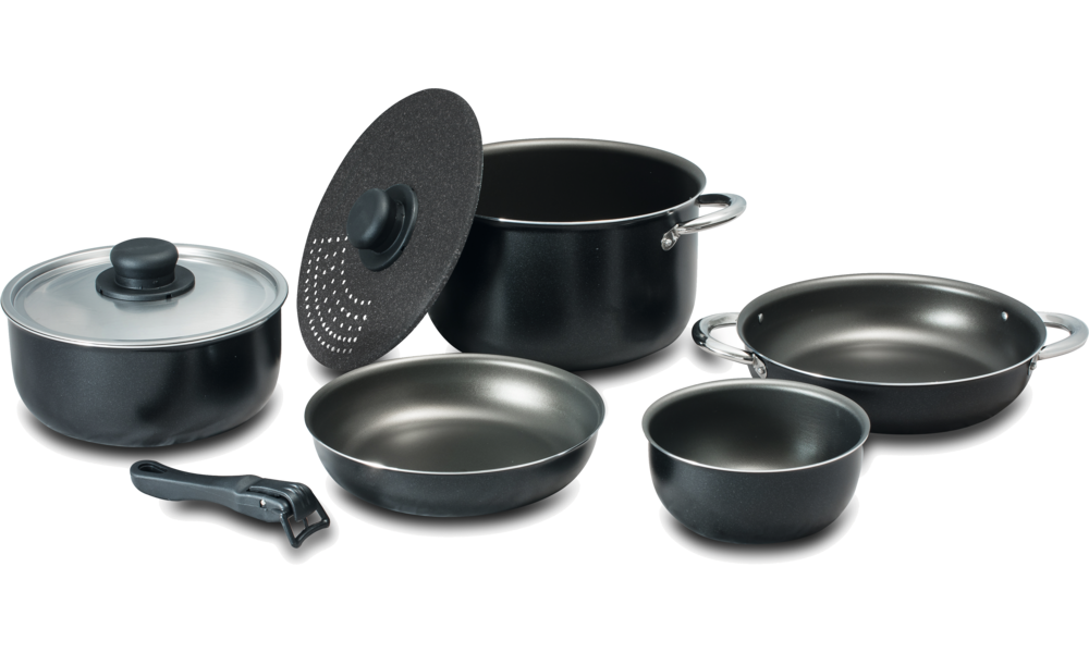 Kochtopfset NERA 22. Kochgeschirr aus 99,5 % Aluminium, lebensmittelecht und mit Antihaft-Beschichtung. 8-teiliges Set bestehend aus 1 Topf ø 22 cm, 1 Topf ø 20 cm, 1 Topf ø 14 cm, 1 Pfanne ø 22 cm, 1 Pfanne ø 20 cm, 1 Deckel ø 20 cm, 1 Siebdeckel ø 22 cm und 1 Stielgriff. Geeignet für vier Personen.
