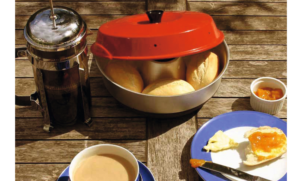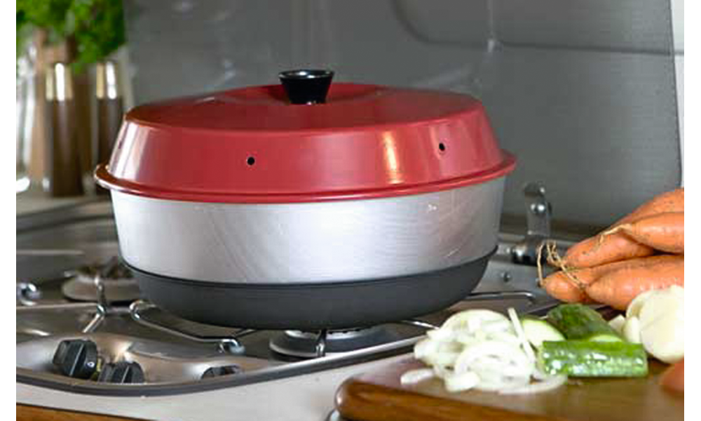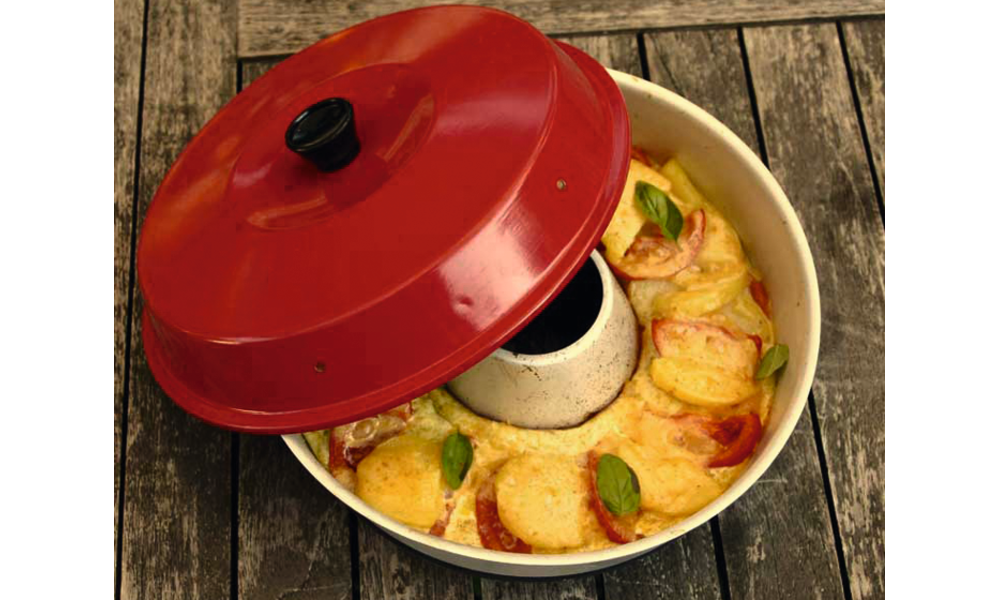 OMNIA Backofen. Der kleine Ofen, mit dem Sie unterwegs backen und Aufläufe machen können: direkt auf der Gasflamme, mit dem Spirituskocher oder auf der Herdplatte. Besteht aus drei Teilen, die zusammen einen Backofen, mit sowohl Ober- als auch Unterhitze, ergeben.