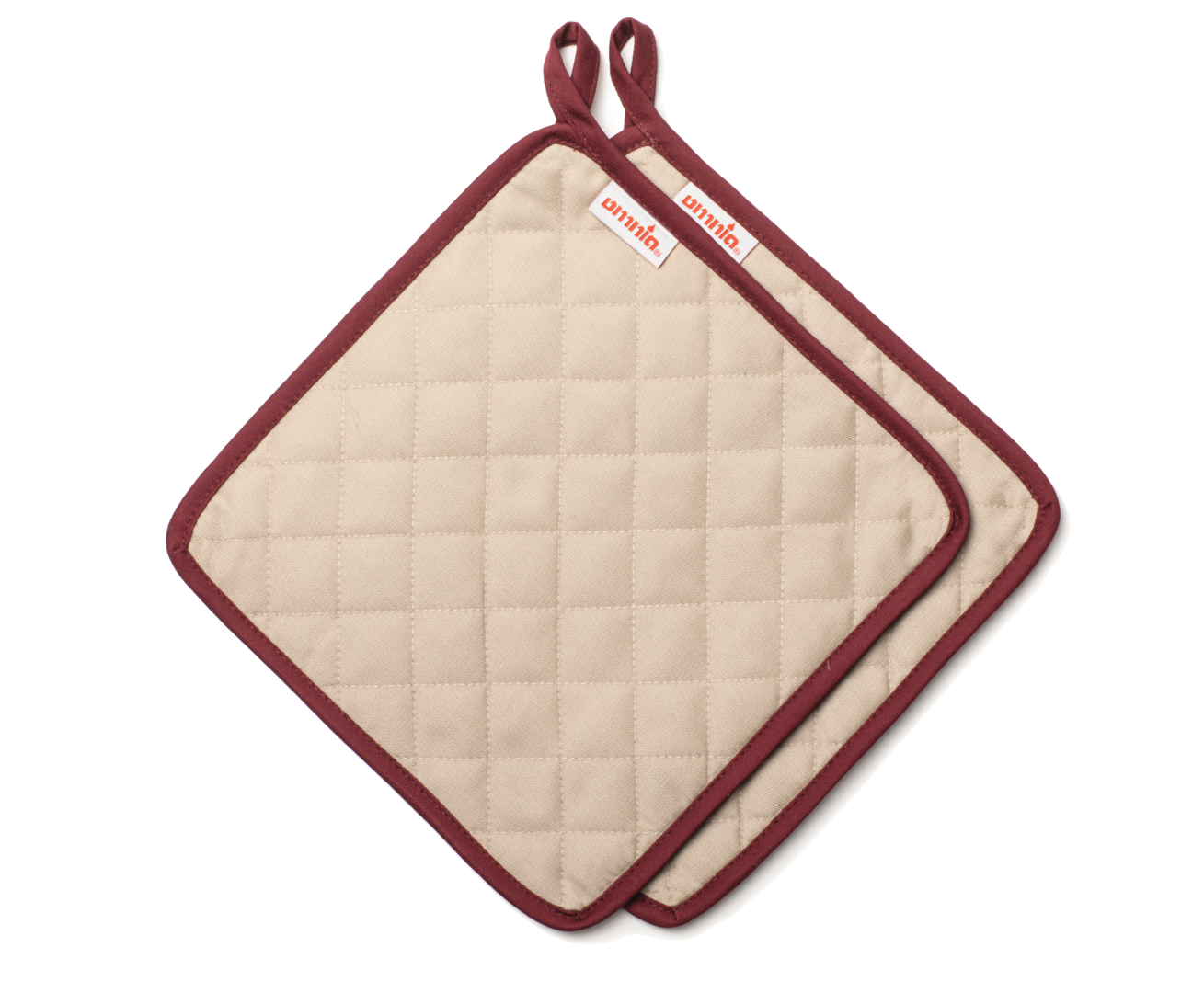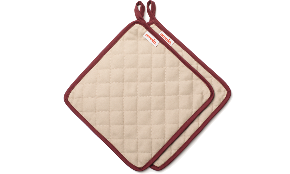 OMNIA Topflappen. Zwei stilvolle Topflappen, 24 x 24 cm, beige mit weinrotem Rand. Material 65 % Polyester und 35 % Baumwolle. Bis 60 °C waschbar.