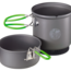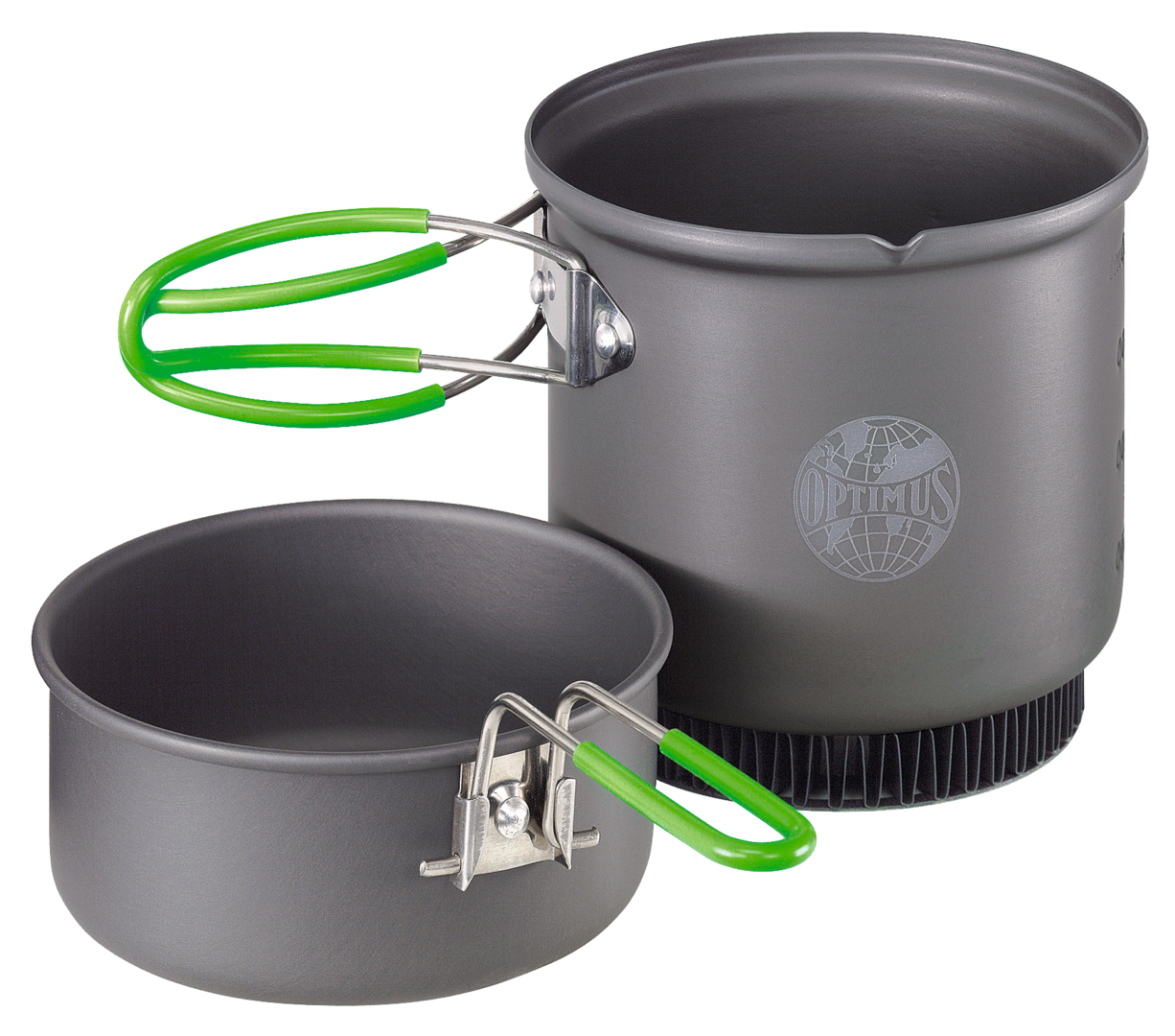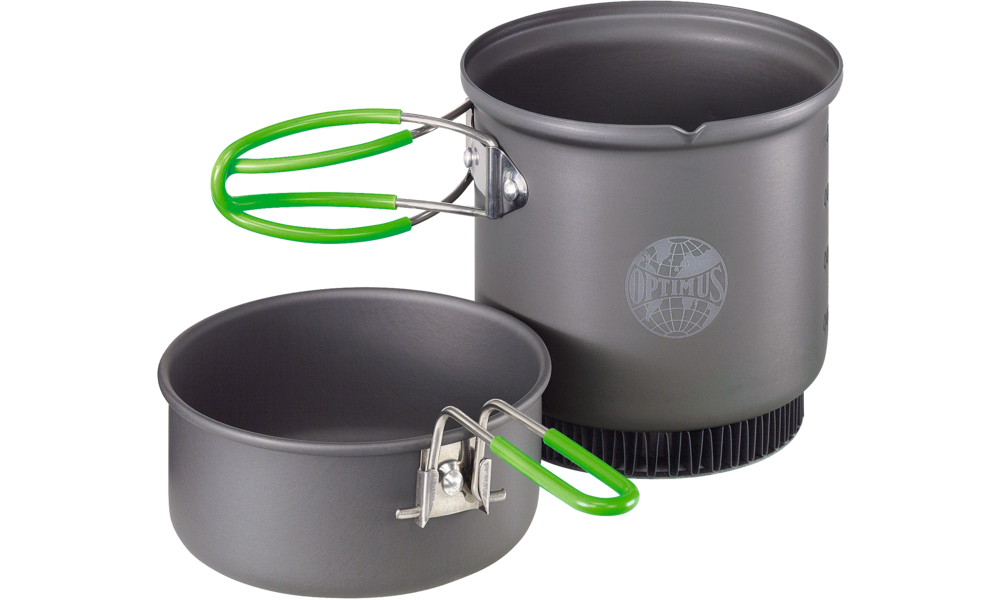 Optimus Terra Weekend. Aus robustem, hart anodisiertem Aluminium mit Antihaftbeschichtung, wodurch es einerseits sehr leicht ist, andererseits mehr Freude beim Kochen aufkommen lässt. Mit dabei der eindrucksvolle, sparsame Heat Exchange Topf, mit dem sich die Kochzeit um 20 % reduziert. Mit dem Topf mit Ausgießer und der robusten Bratpfanne (die gleichzeitig als Topfdeckel dient) lässt sich wunderbar kochen und braten. Das alles passt ordentlich aufgeräumt in die Netztasche, mit Platz für Titan-Besteckset und Optimus Gaskocher. Fassungsvermögen 0,95 l.