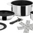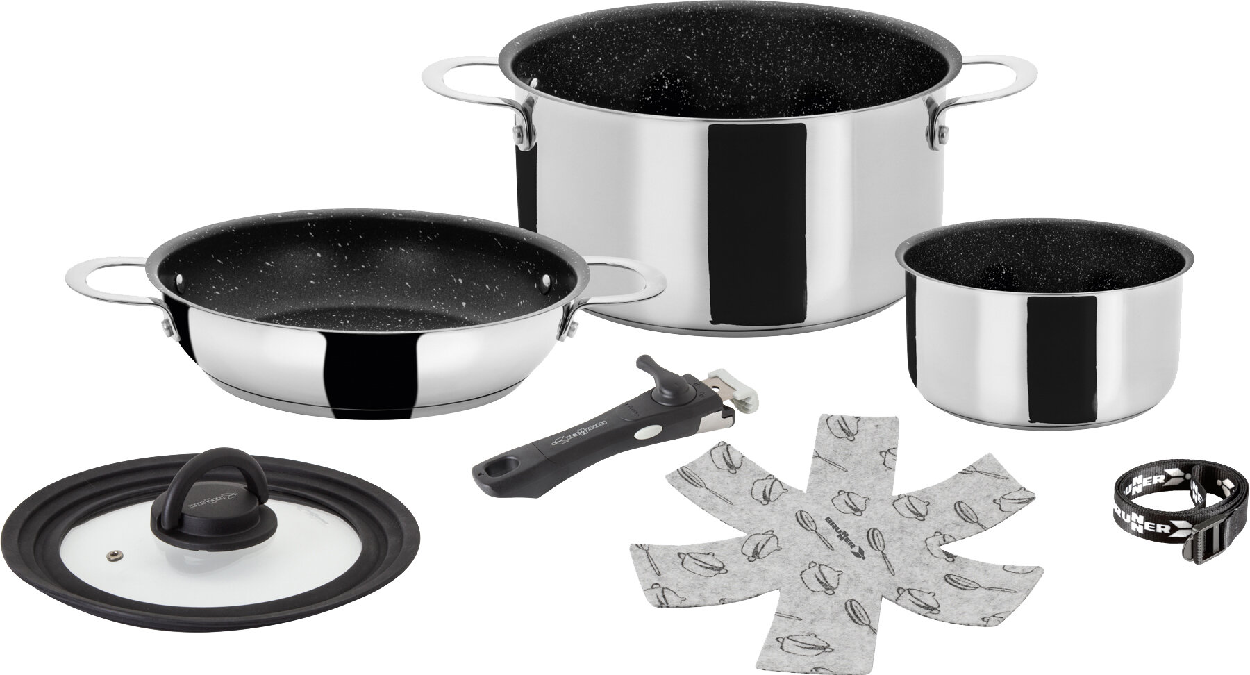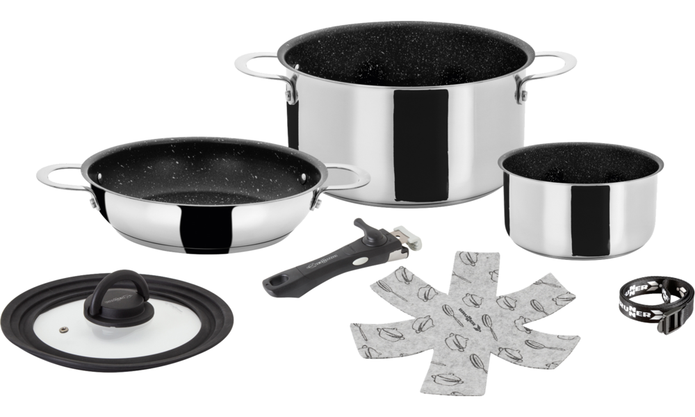 6-teiliges Set bestehend aus 1 Topf ø 22 cm - 3,8 l, 1 kleiner Topf ø 16 cm - 1,4 l, 1 Pfanne ø 22 cm, 1 Deckel ø 22/20/18 cm, 1 Griffzange und 1 Gurt.