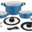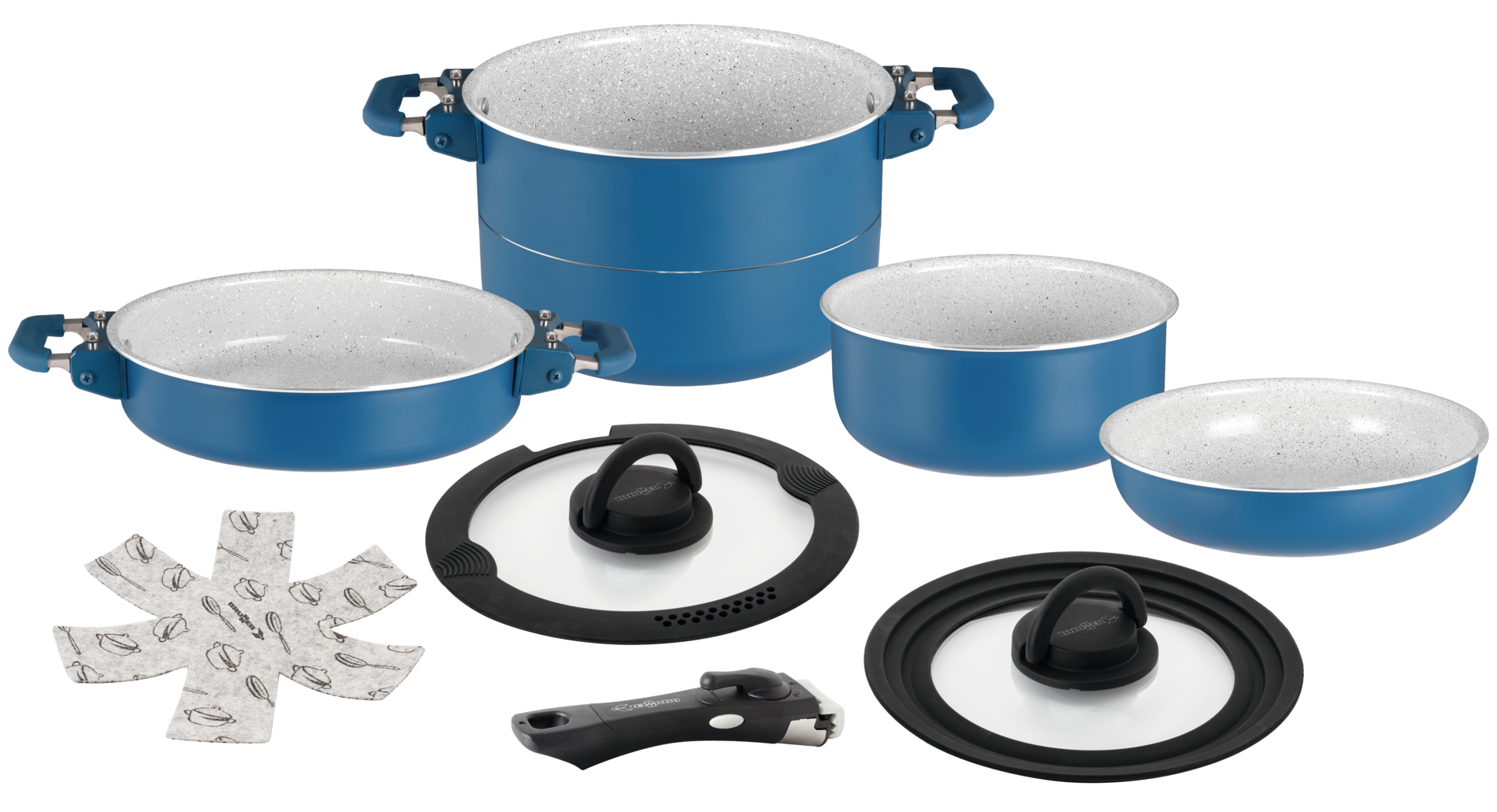 8-teiliges Set bestehend aus 1 Topf ø 22 cm - 4 l, 1 Topf ø 18 cm - 2 l, 1 Pfanne ø 22 cm - 1,5 l, 1 Pfanne ø 20 cm - 1,5 l, 1 Deckel ø 22 cm, Deckel ø 22/20/18 cm, 1 Griffzange, 1 Topf- und Pfannenschutz.