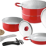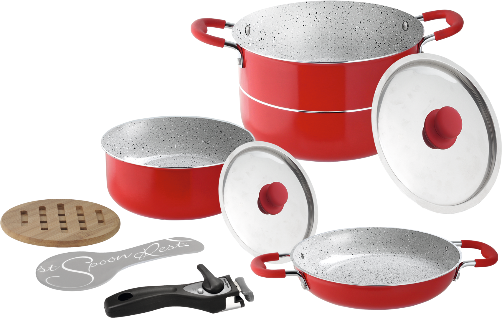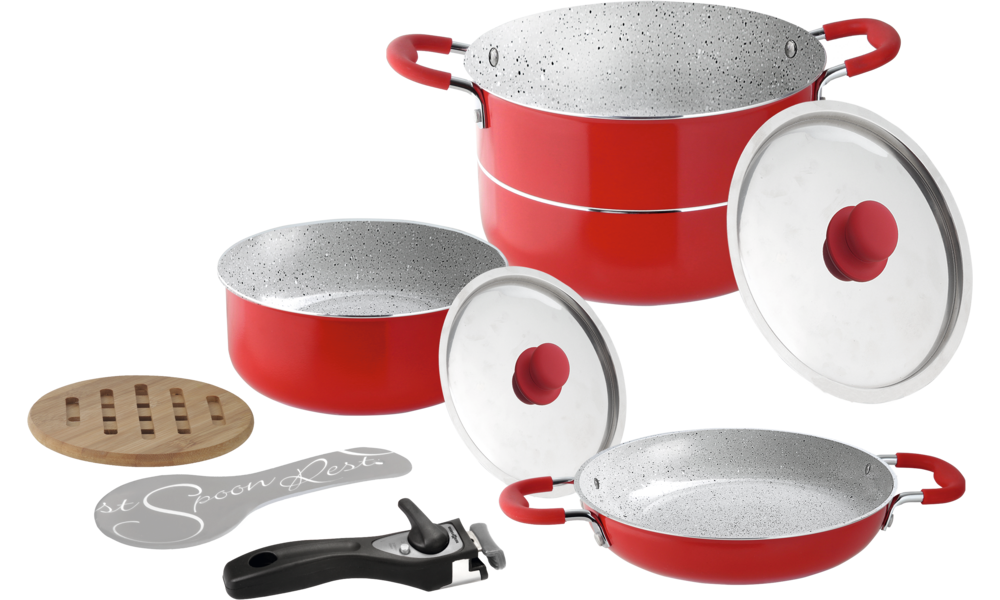 Kochtopfset COSMIC 8+2 ø 22. 10-teiliges Kochtopfset aus Aluminium mit langlebiger Antihaft-Keramikbeschichtung. Hohe Kratzfestigkeit. Silikonbeschichtete Griffe um Verbrennungen zu vermeiden und Rutschfestigkeit zu garantieren. Leicht zu reinigen. Induktionsgeeignet. Set bestehend aus 1 Topf ø 22 cm - 5 l, 1 Topf ø 18 cm - 1,4 l, 1 Pfanne ø 22 cm - 1,5 l, 1 Deckel ø 22 cm, 1 Deckel ø 18 cm, 1 Griffzange, 1 Kochlöffel, 1 Bambusuntersetzer, 1 Aufbewahrungstasche (31 x 54 x 27,5 cm) und 1 Gurt.
