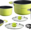 Alu-Topfset mit Edelstahldeckel und Antihaft-Beschichtung. Silikonbeschichtete Soft-Touch-Griffe.