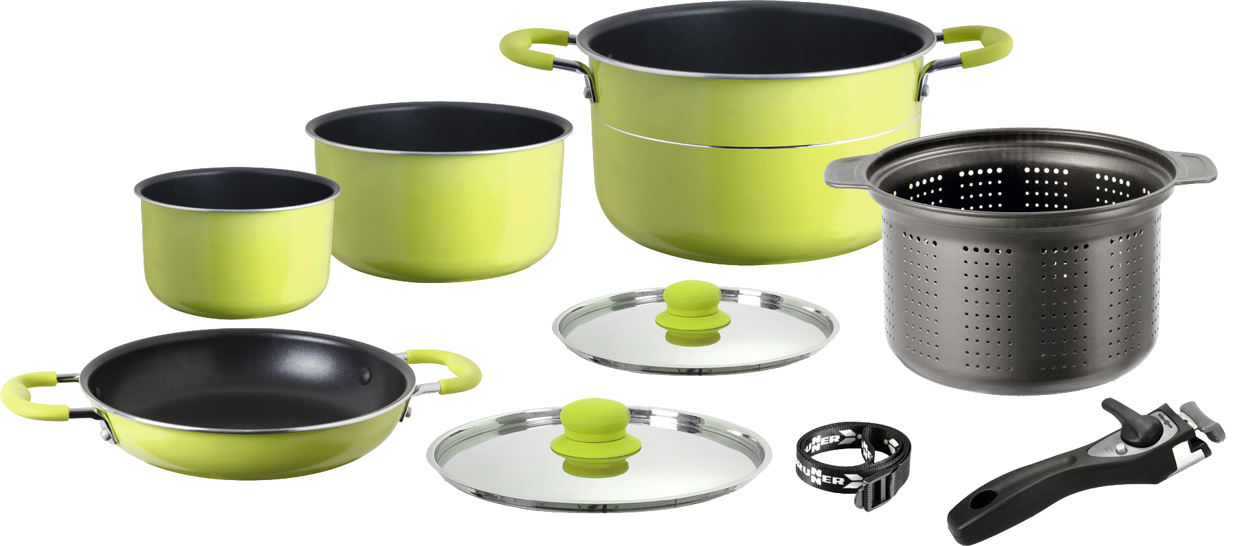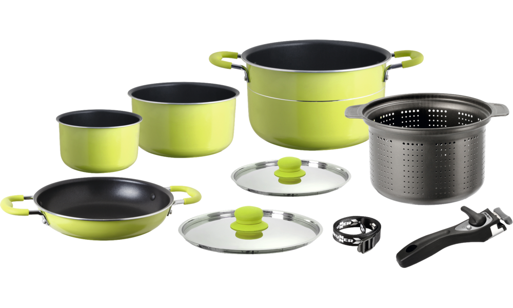 9-teiliges Topfset bestehend aus 1 Topf ø 24 cm - 6 l, 1 Topf ø 20 cm - 2,3 l, 1 Topf ø 16 cm - 1,4 l, 1 Pfanne ø 24 cm - 1,4 l, 1 Pastasieb ø 22 cm, 1 Deckel ø 24 cm, 1 Deckel ø 20 cm, 1 Griffzange und 1 Gurt.