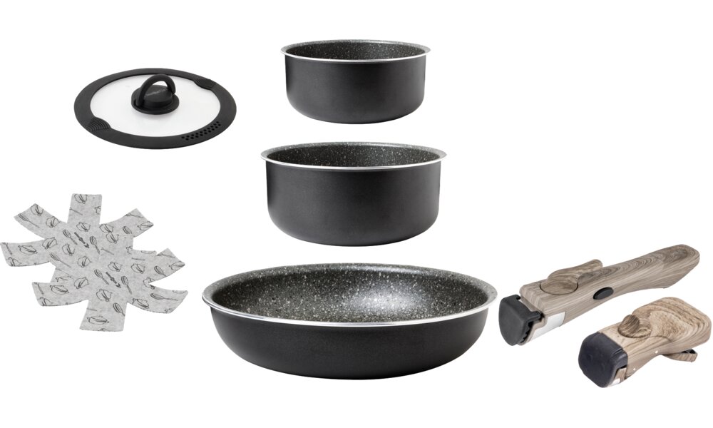 7-teiliges Set bestehend aus 1 Pfanne ø 26 cm - H 5 cm, 1 Topf ø 22 cm - H 10 cm, 1 Topf ø 18 cm - H 9 cm, 1 Deckel ø 22 cm, 1 kurzer Griff, 1 langer Griff und 1 Tasche.