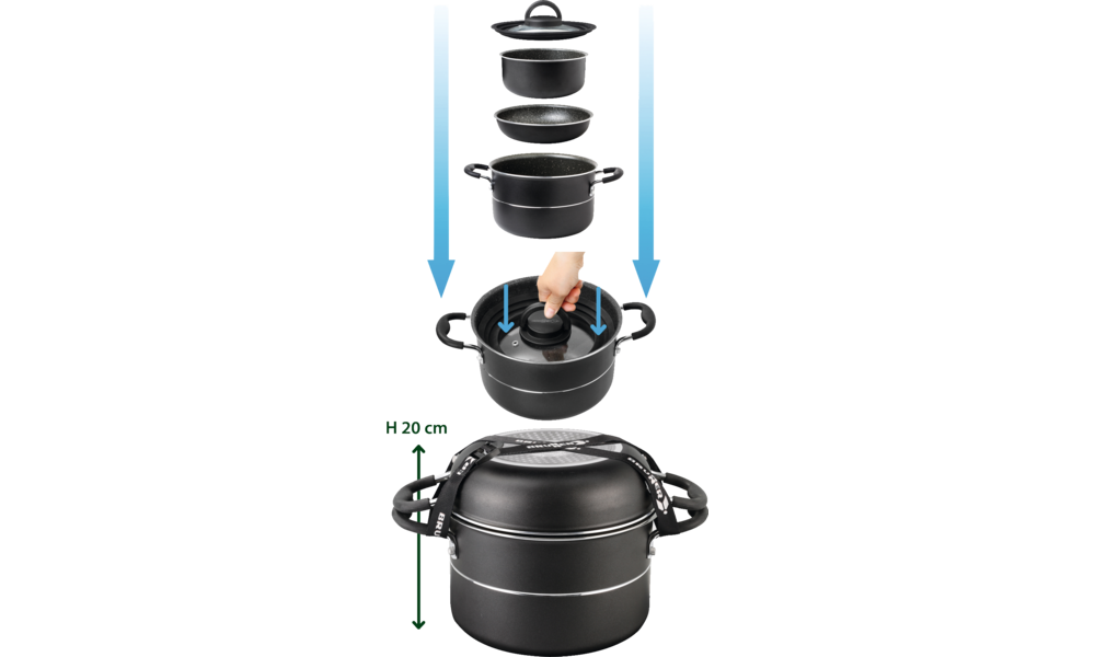 1 Pfanne ø 22 cm - 1,8 l, 1 Topf ø 20 cm - 3 l, 1 Deckel
